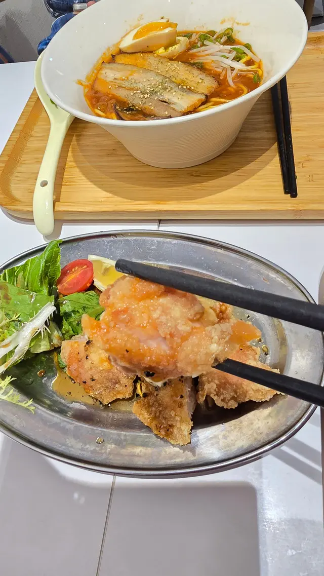 喺觀塘返工嘅友人介紹咗呢間觀塘樓上拉麵店俾我,佢話佢食過覺得呢間拉麵嘅湯底超級正,呢晚我就嚟食返餐試吓😙極尚濃蝦湯拉麵啱晒咩都想試嘅我呀,配料方面有慢煮雞胸、日式叉燒、日本帶子、鮮蝦、仲有招牌溏心蛋🥰 真係勁豐富㗎。湯底用上濃蝦頭番茄湯底,鮮甜美味,老闆話佢哋用上20斤嘅蝦頭熬製,真係飲一啖已經知佢真材實料🦐熊本蠔濃蝦湯拉麵期間限定嘅新品,上面嘅配料有鮮蝦同埋飽滿肥美嘅蠔B🦪 配埋濃郁嘅湯底真係好正,鍾意海鮮嘅朋友一定啱口味。呢度嘅拉麵幾爽彈,麵條又掛湯,食完真係大滿足,好推介大家過嚟試吓🍜 南蠻炸雞餅配碎蛋沙律呢度除咗拉麵,都有沙律同小食供應 。南蠻炸雞好大件,配埋面頭嘅碎蛋沙律食就唔會太油膩 。飲品最特別就係自家製樽仔奶茶,奶茶好有港式風味啊😄食得出呢間拉麵小店嘅湯底真係落足料熬製,真係好鍾意佢嘅濃蝦湯,下次嚟觀塘再食過先得😋…查看更多
