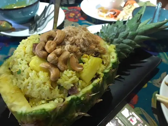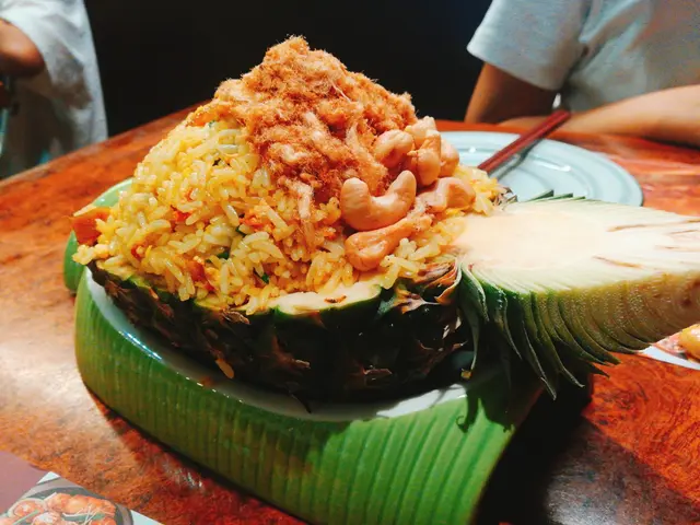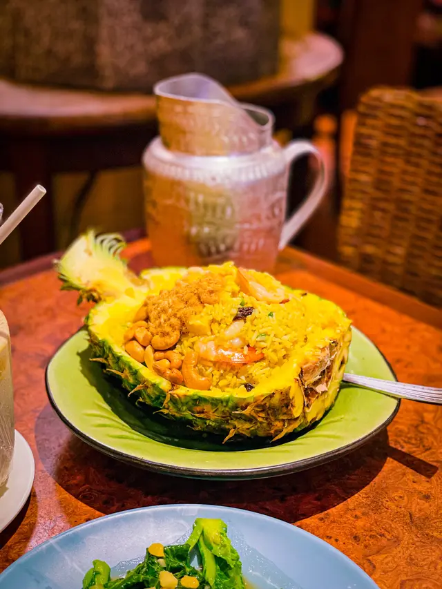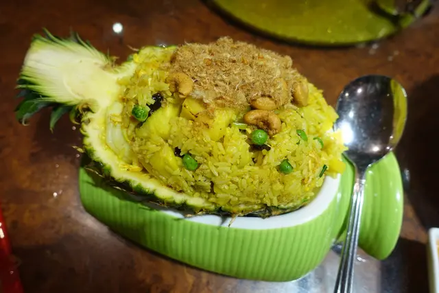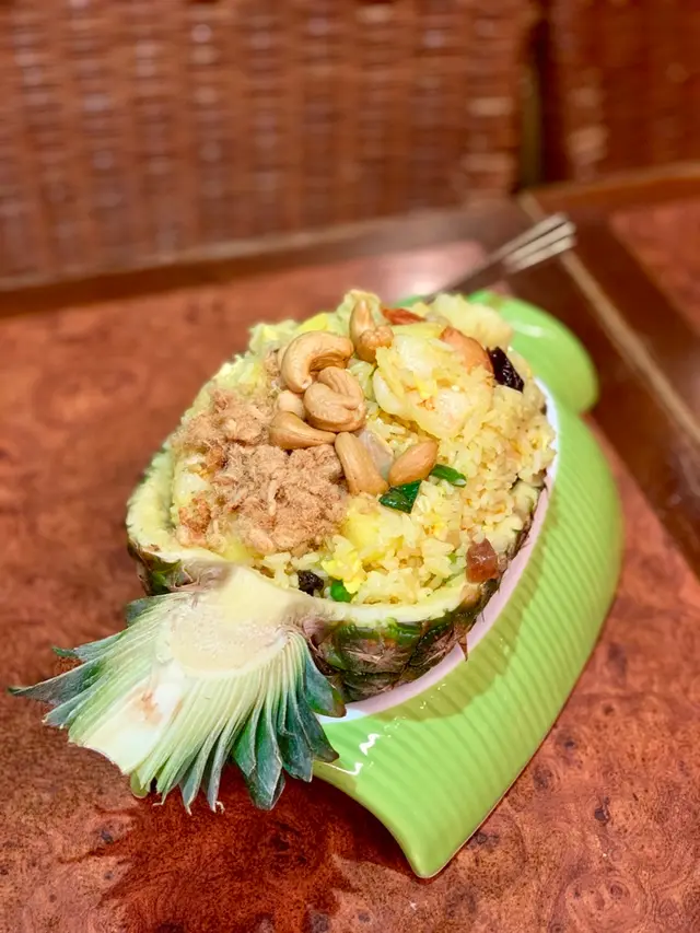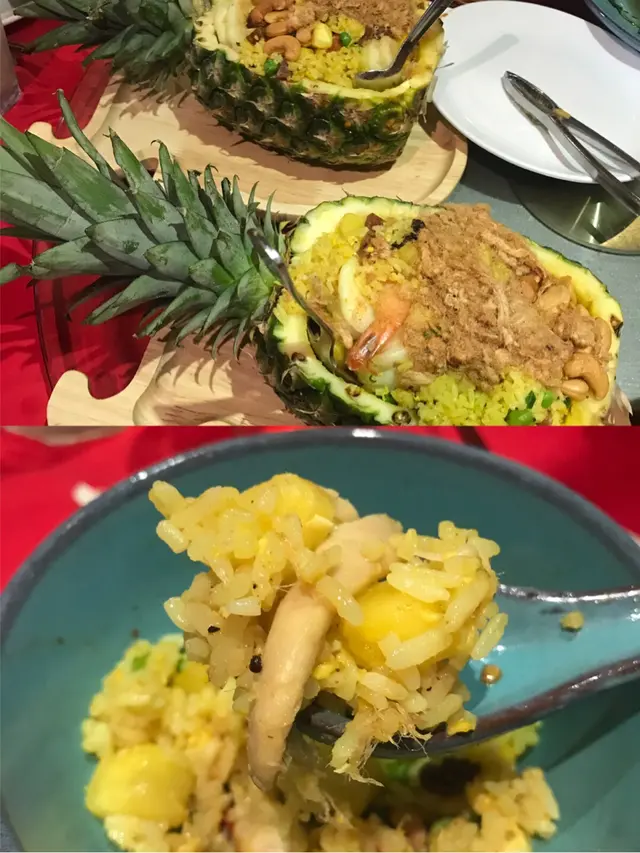 菠蘿炒飯氣勢凌人,大大個勺到瀉晒,炒飯充滿菠蘿香,食到底刮吓啲菠蘿肉,好新鮮多汁,肯定冇重用