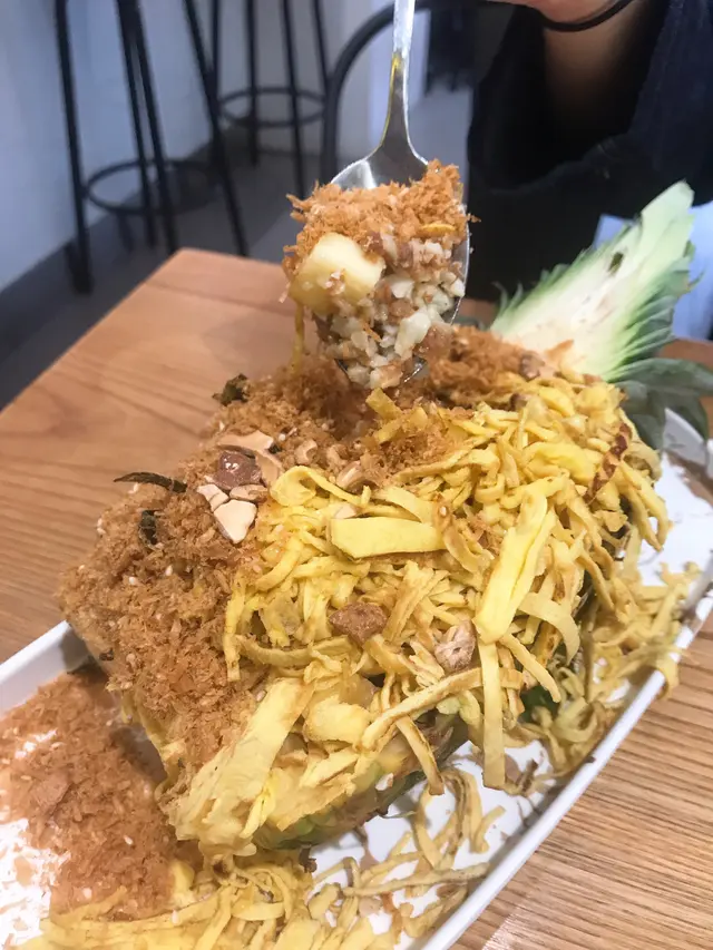 兩、三年前聽過一位朋友推介過2DP,她說想不到素食都可以如此新穎、味道好,我save低後一直也沒有機會試試。時至今日,新派的素食比以前常見,而今天晚上朋友們本身打算去食牛扒,可是已經滿座,我就提議不如來食2DP吧。雖然牛扒跟素食是兩個極端,但是朋友們看過餐牌後都覺得她們的食物很有趣,決定試試:)雖然比較多人推薦飲這裡的水果梳打,但是我對餐牌上寫有牛油果的防彈奶昔(普通版)($58)比較有興趣。飲品比我想像中細杯,大概是比熱飲紙杯大一點,又比凍飲紙杯細一點。最初我以為牛油果會打進飲料裡面,但原來就是上面的一片,沒有味道,大概不太新鮮,我心想現在的牛油果很貴嗎?😅奶昔裡面加入了朱古力粉和飲到奶粉的味道,我覺得很普通。原本我們打算點以原個南瓜上菜的燴飯,誰知售罄了,我們只好點常規南瓜忌廉燴飯($128)。燴飯保留了少許咬口,醬汁creamy但不會太膩,反而是偏向輕盈一點,食得到南瓜味但我覺得濃一點會更好吃,不知道原個南瓜的那款會濃郁一點嗎?裡面還有不少的蘆筍,幸好都是爽脆新鮮,不舊沒有渣。牛肝菌Impossible肉碎闊條麵($118)是重口味之選。牛肝菌的香氣強烈,以它弄成醬汁掛在保留一點硬度的闊條麵上很是惹味,加上本身調味濃郁的Impossible meat模仿肉碎的口感,整碟意粉濃味得來味道都幾好,所以很受我的朋友歡迎。原隻菠蘿炒椰菜花飯($188)上面擺上不少的蛋絲、花生、素肉鬆去營造那款泰式的感覺。椰菜花飯裡面有很多提子乾和菠蘿粒,配合前面提到的配料的確令單調的椰菜花飯增添了不少味道和口感,幾特別。50/50蕃茄自家製水牛芝士($138)是一個薄底的pizza,薄得基本上是一個脆片底,但是那個脆餅底又有番茄、芝士和蔬菜配料,感覺清新豐富,是一個輕盈的薄餅。朋友們見到這個很吸引的蜜瓜牛乳刨冰($108)就點一個試試。外貌上這個刨冰的確吸睛,以半隻蜜瓜盛著,表面又有一個個圓滾滾的蜜瓜波波