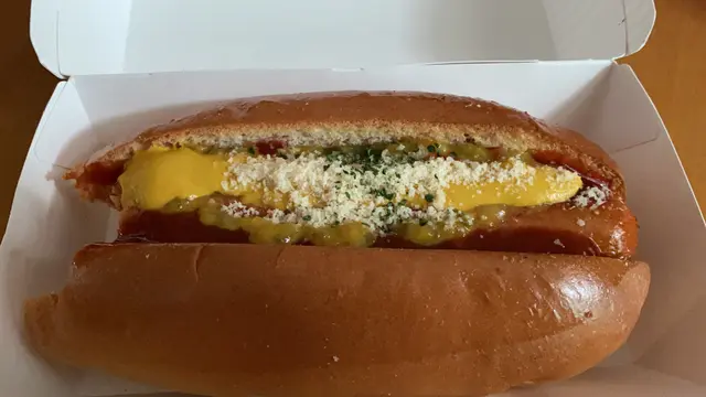 ,賣相好似傳統熱狗,因為會搵到晒三色醬—青色(酸瓜)、黃色(芥末)同埋紅色(茄醬)