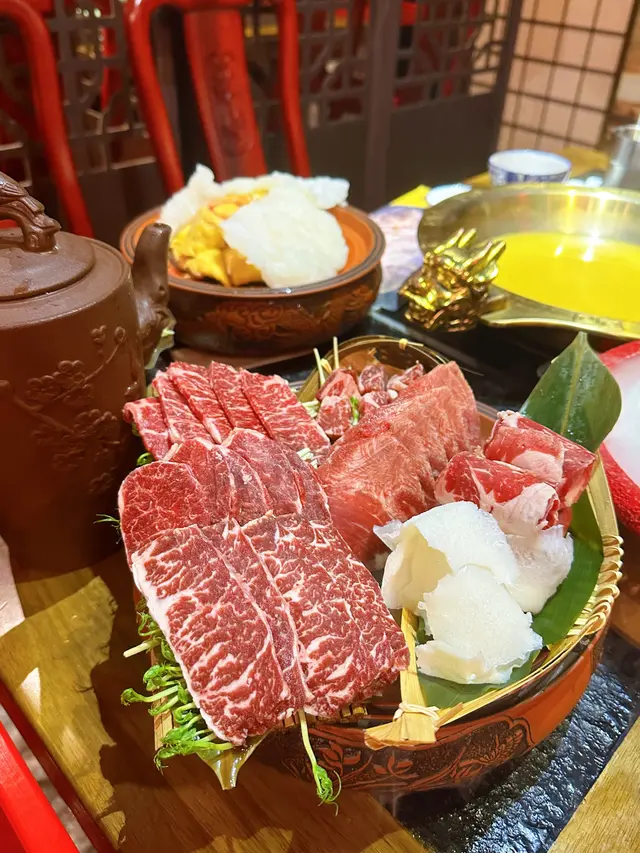 間中就會去大埔大滾友打邊爐,中國宮廷式裝修,一入門口已有張金閃閃皇帝龍椅俾人打卡登基,盡顯氣派。 今次湯底選了半隻花膠雞湯鍋,湯底呈清澈的淡金黃色,雞肉軟嫩多汁,湯頭滑順濃郁,花膠養顏美容,釋放的膠質讓湯底略帶黏稠感大滾友牛肉拼盤(細) 肉材有人手切吊龍、本地手切牛頸脊、澳洲和牛金錢展、美國頂級雪花肥牛、牛黃喉、牛肉粒和牛舌花。在清甜鮮美的花膠雞火鍋湯底中燙食不同牛肉部位,能突出食材原味,牛味濃厚,湯汁輕裹肉片,增添膠質的順滑感。金屋藏嬌和牛墨魚丸手打工藝讓丸子質地緊實卻不失彈性,結合和牛的濃郁肉香與墨魚的鮮甜彈牙。即炸響鈴即炸後快速燙食,金黃酥脆,外脆內軟,吸收雞湯的溫潤甜香。黑松露蟹肉餃餃子外皮厚薄剛好,薄皮口感嫩滑,內餡紮實豐滿,結合蟹肉的鮮甜與黑松露的馥郁菌香。酥炸小菇菇外觀金黃酥脆,炸漿均勻裹覆菇體,內裡保留菇類特有的彈性嚼感。炸支竹本身濃郁的豆香,相比即炸響鈴,支竹更厚實,吸湯力強。薯粉晶瑩通透,口感煙韌彈牙,更可以吸盡濃稠湯底,滋味無窮。爆漿芝士腸外層腸衣Q彈有嚼勁,內層芝士爆漿流出,集合濃郁奶香與肉香。手打蟹子鮮蝦丸純手工打造確保彈性,以新鮮蝦滑為基底,混入蟹子增添鮮味。火焰焦糖豆腐花以木桶盛載的豆腐花,做法有如西式甜品焦糖燉蛋,即場灑下黃糖再倒酒,以火槍點火燃燒,將表層炙燒成焦糖脆殼,與滑溜豆腐花形成一嫩一脆的極端質感。自家製竹蔗茅根1渣草本清香緩解飽滯感,有清熱祛濕功效,能調節火鍋的溫熱性質,避免上火。…Read More