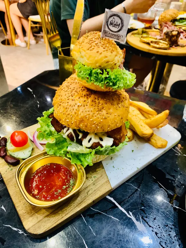 今日好開心去到no boundary 之前曾經食過一次堅尼地城店,未試過銅鑼灣店。佢有一個二人餐,揀兩個main , 配有湯及飲品。餐湯-磨菇湯好味道,磨菇蓉好滑好creamy , 最緊要係佢個環境,勁舒適,好岩兩個人靜靜傾計。樓底亦高,好舒服既環境。煙鴨胸香蒜炒意粉這個main 個煙鴨胸好好味。甜甜地,上面有一層蜜喜戈,而個鴨胸亦做到好香。意粉份量亦夠。價錢更驚喜,$98。銅鑼灣黎講真心抵。大細路漢堡有趣在這個burger, 一大一細, burger 上面仲有個小burger. 絕對吾hea. 。裡面係牛肉burger 有煙肉仲有好多cheese,配粗薯條。雙色薯條另外一份薯條,蕃薯條及原本薯條,十分好味。兩杯都係特飲,需要加套餐價$18但都真係幾好味,最緊要係大家enjoy 檸檬青檸梳打Oreo 朱古力奶…查看更多