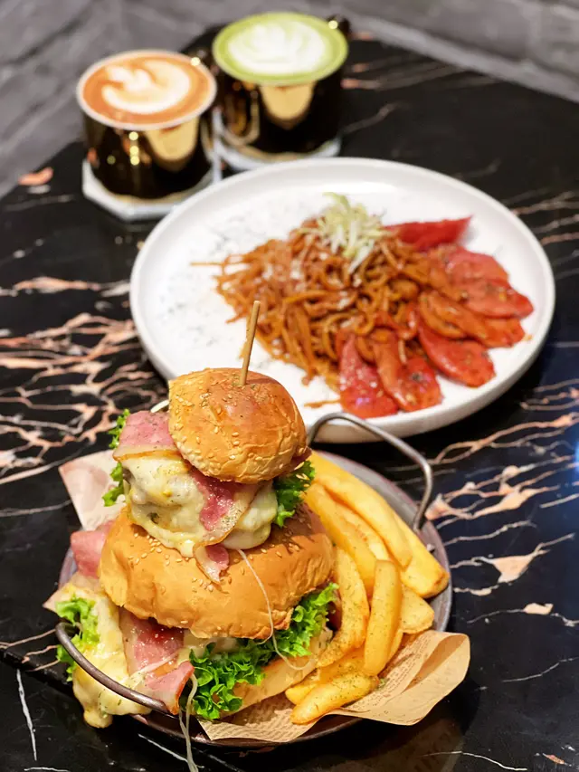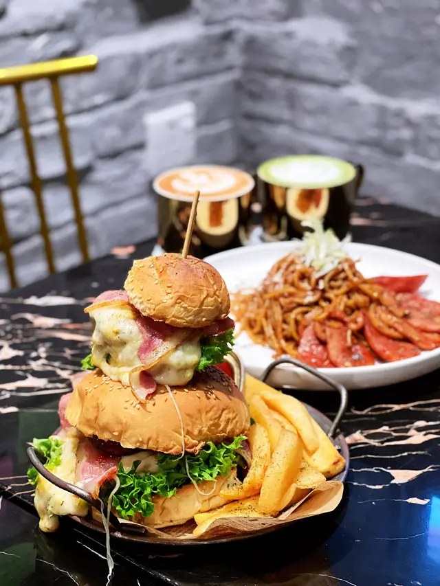 這間咖啡店於銅鑼灣、荃灣、北角和西環均有分店,銅鑼灣分店裝潢亦以黑色為主,有仿雲石枱及水泥灰牆;主打多款西式食物,如漢堡包、意大利麵、意大利飯、All Day Breakfast及沙律等等,均即叫即製非常新鮮。大細路漢堡 - $188一大一小的漢堡相當趣致,外脆內軟的漢堡包滿佈芝麻粒,塗上牛油及蕃茄醬,夾著烤楓糖煙肉帶煙燻及油香,牛肉漢堡厚度十足, 口感扎實,充滿牛脂香,味道濃郁多肉汁,更有半溶化的芝士和生菜等配料;而大漢堡更有口感,特別多了波特菇,口感較緊實,香味濃郁;金黃酥脆的粗薯條薯肉比例特別多,口感綿密。煙鴨胸香蒜炒意大利粉 - $98一片片鴨胸香厚彈嫩緊實,肉質鮮嫩多汁帶有煙燻香氣,煙韌彈牙的意粉吸飽鹹香的醬汁,有濃濃的蒜香。升級套餐 +$38飲品可享套餐價暖心麵包一條條外酥內軟的麵包條塗滿牛油蒜蓉。廚師精選濃湯是日為粟米湯,香甜的粟米,充滿牛油及忌廉香。Vanilla Latte +$28綿密的奶泡下,香甜的雲呢拿芬香四溢,融合柔和的鮮奶及濃郁的咖啡,更易入口。Green Tea Latte +$18濃郁的抹茶配上幼滑的鮮奶,變得甜味適中,入口清新帶微微回甘。…查看更多
