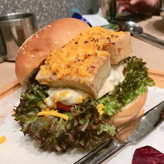 漢堡包亦做得很出色,以半溶的素芝士、入味彈牙的大醬百頁豆腐、蕃茄及沙津菜做餡料,整個包食落口感非常豐富