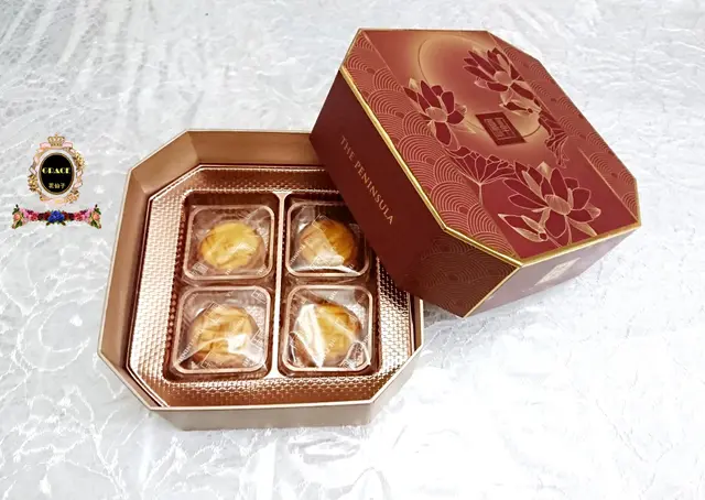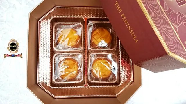 半島月餅是半島 Peninsula Boutique 出品,而迷你奶黃月餅於 1986 年由半島酒店首創,早已晉身香江經典之列,是中秋團圓與親朋共享之雋品。今年繼續深受香港人和大陸人喜愛,全城搶購!:) 一盒 8 個,賣相精緻小巧,幾乎一口一個呢!餅面印有『半島』二字,一看便知。