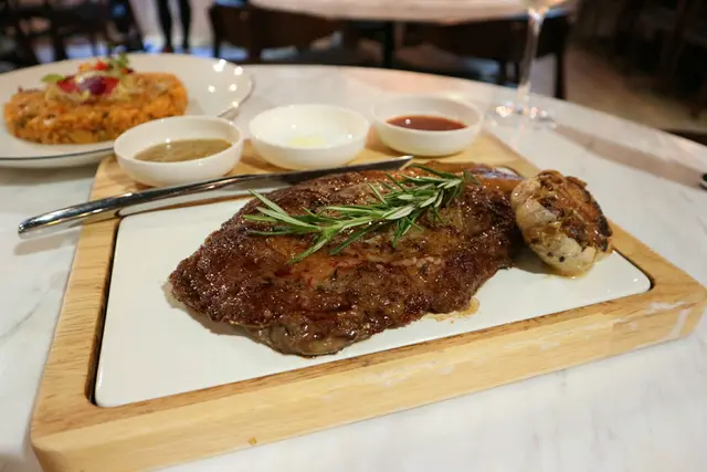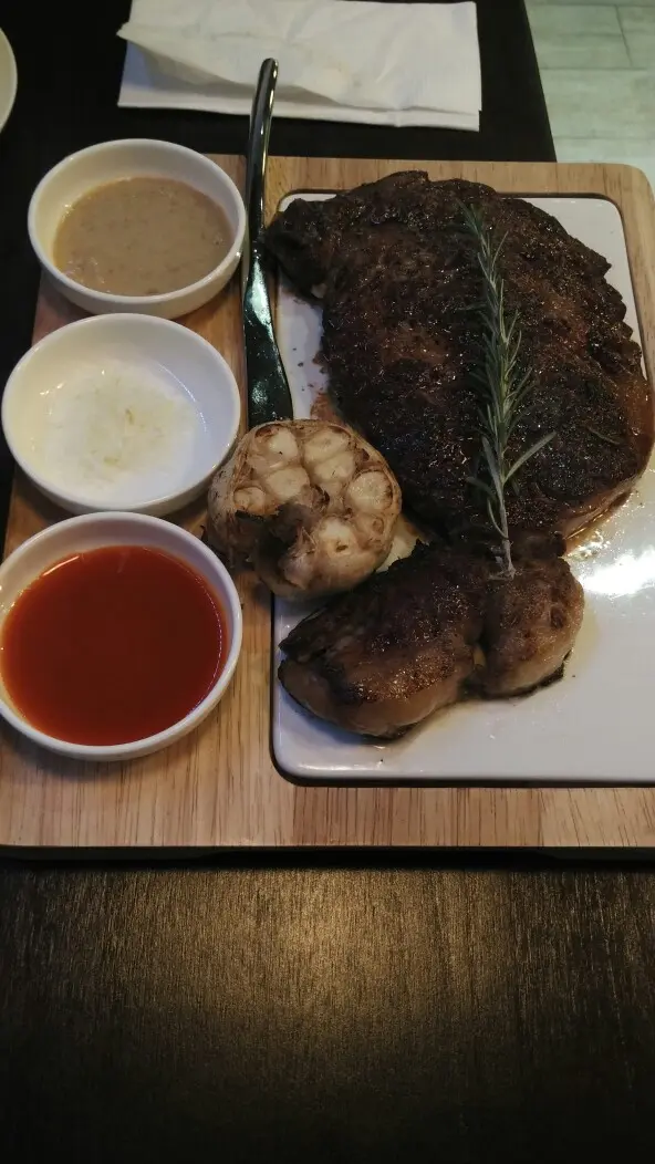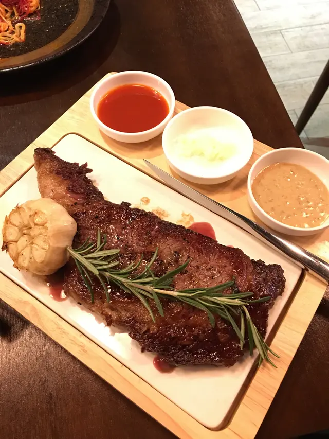一知道有新的韓國菜, 又點走得出我五指山✋ 環境好寧靜, 裝修亦好別緻😊如果在小每勿島上搭橋=香煎西冷牛扒店員建議煎5成熟就足夠, 因為底板會一直熱住牛扒, 會愈黎愈熟! 3款醬汁分別係芥末蒜蓉、檸檬鹽同埋甜酸醬😋 牛扒煎得好平均, 口感好軟, 都冇煎燶. 旁邊焗過的蒜頭可以配上牛扒同醬汁一齊食, 蒜頭的口感有d似熟薯仔, 一齊食好夾🙋🙋北漢山看雲海=清酒硯湯最頂的配料係薄荷葉, 覺得加落硯湯味道怪怪. 硯湯本身偏咸, 但酒味淡淡帶出硯的鮮味, 硯的數量都意外地多, 大概有30粒🙆仙巖村的秋天=酸甜芝麻湯喬麥麵唔知係咪因為未完全解凍, 有d喬麥麵係痴埋一舊. 湯底似芝麻醬味道, 不過加左d檸檬酸既感覺, 好開胃!…查看更多