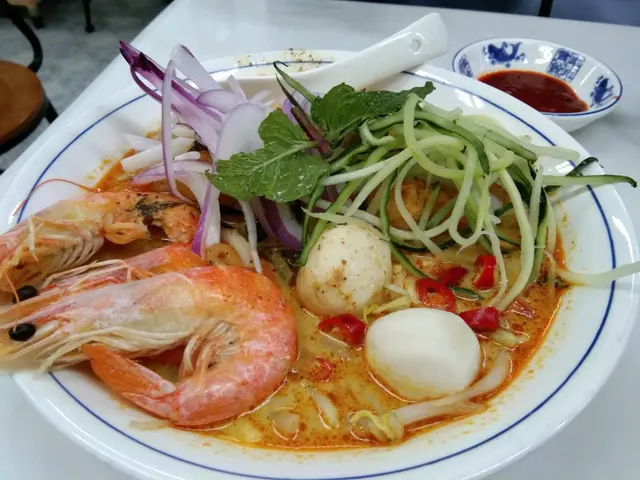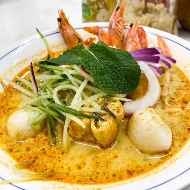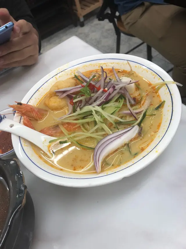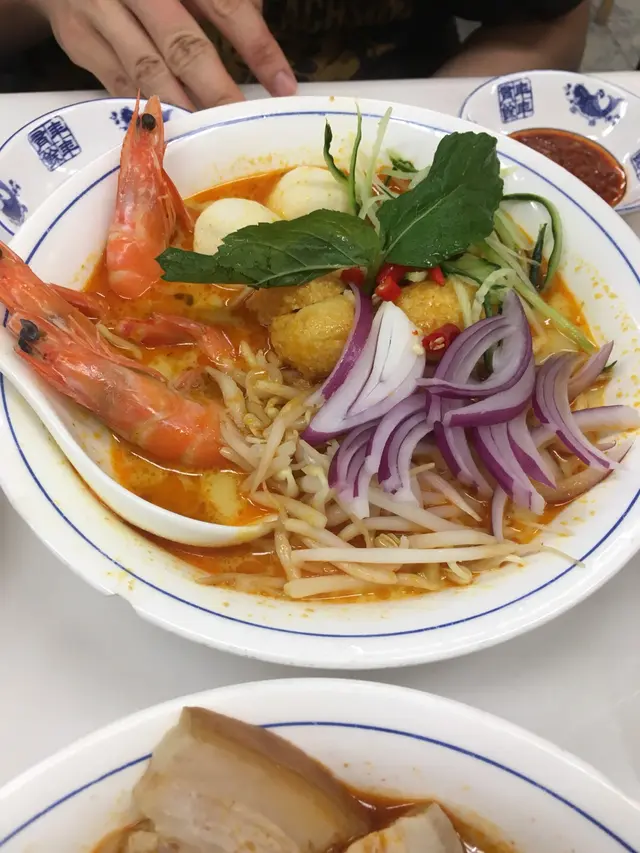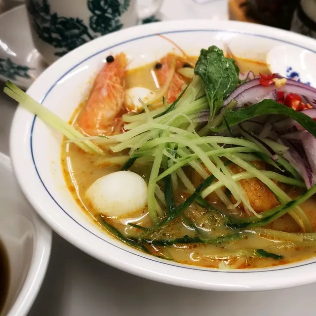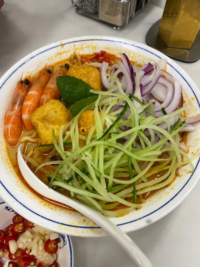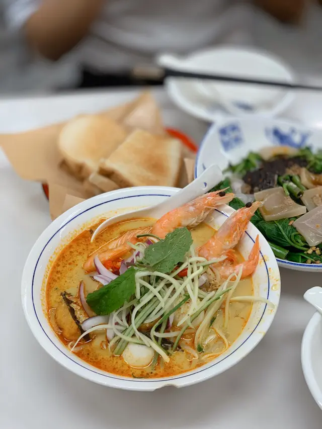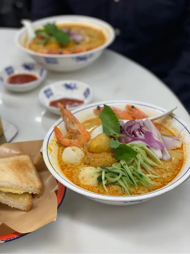 #🍎👧🏽行經深水埗想食碗蝦麵🤤無意中發現一間同蘇媽·蘇媽相似度十足嘅馬拉菜😲 由門面到食物款式都好似🙈仲要兩間都排曬隊 一於試吓邊間好食啲先~🔻鮮牛油咖央多士🥪($29)咖央多有三件 都脆嘅但可以再熱啲 咖央醬份量唔算多但偏甜🙈 加埋牛油嘅軟滑真係超邪惡!!😼 不過美中不足係牛油厚薄不一🤔 🔻舊街白咖喱麵🍜 ($65)🔻檳城福建蝦麵🦐 ($65)🔻娘惹喇沙🌶($65)三碗麵嘅配料都大同小異 有蝦 魚片 豆卜 仲有通菜同芽菜 👧🏽最鍾意呢種短肥芽菜🤣好清甜~白咖喱麵多咗兩件豬紅 福建蝦麵就有豬腩片🤪湯底方面 白咖喱相對清淡 椰漿味較突出 唔落辣醬的話成碗麵係完全唔辣的🙈喇沙湯就係微辣呢度嘅蝦湯比較清 冇蘇媽·蘇媽嗰碗咁橙紅色 蝦味都重但鮮味爭啲 不過最大問題係麵質偏淋☹️🔻馬來亞拉茶🌱<熱> (跟餐+$8)🔻怡保白咖啡☕️<熱> (跟餐+$8)拉茶嘅茶味好濃 微澀白咖啡都好香滑但比拉茶略甜~(整體都係私心蘇媽·蘇媽🤫)---------🍴食物:6/10🏝環境:5.5/10🛋服務:6/10💲價錢:6.5/10💥翻兜指數:6/10✨CP值:6/10…查看更多