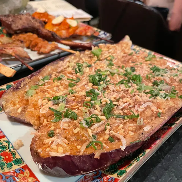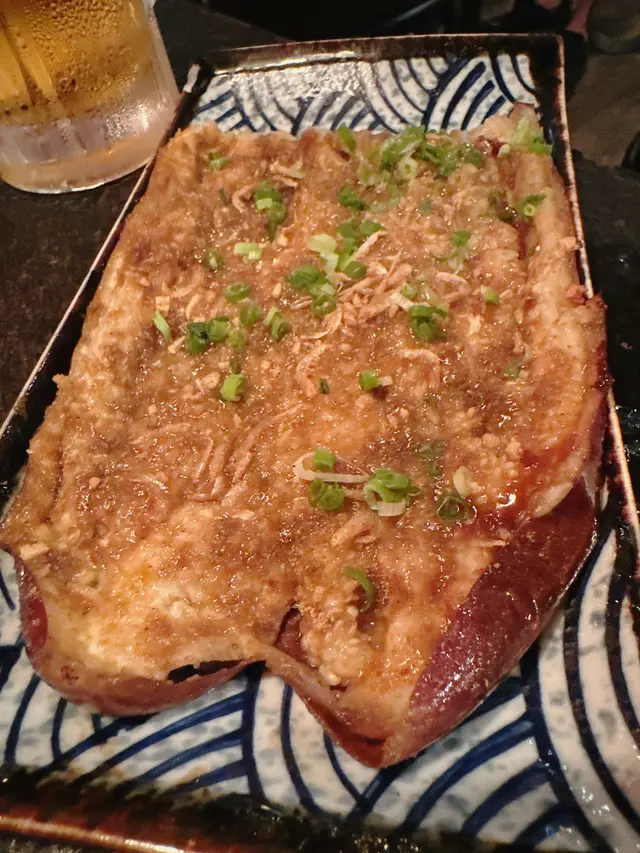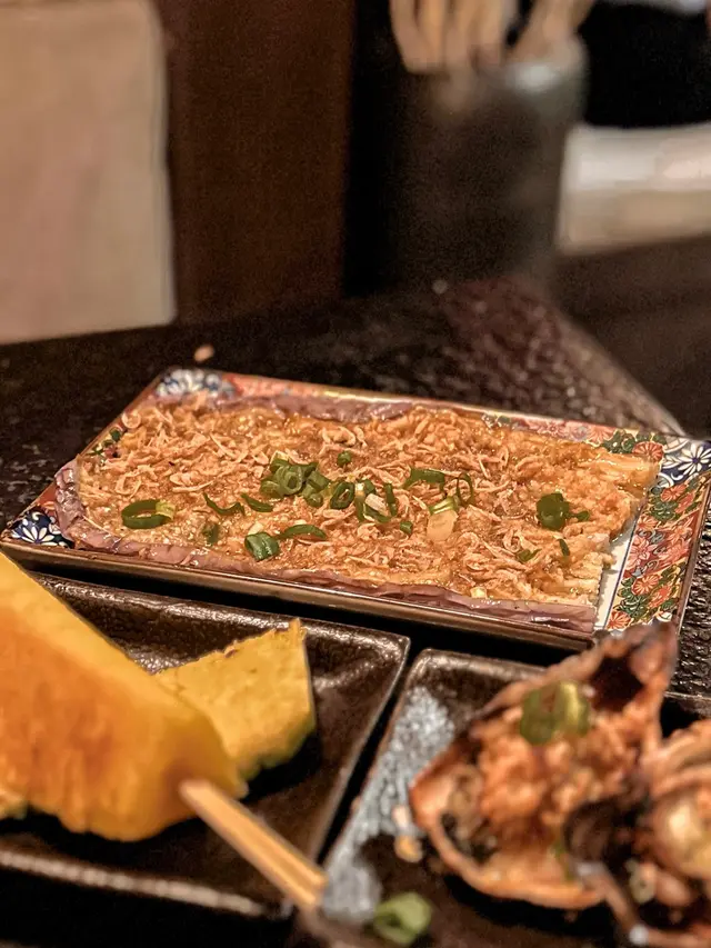 12月是聖誕節的月份,又有藉口可以約朋友出來聚會啦🤩今次聚會去了位於中環的本地人氣串燒專門店「燒烤堂」🍢已是第3次到訪啦😂中環的「燒烤堂」裝潢採用日式風格,更設有吧枱座位,晚上6時半到達已座無虛席,好熱鬧又有氣氛❗️這裡一直吸引著我的是有多款自家創意口味的串燒,價格親民❣️浜燒日本活北寄貝 $58新鮮厚肉的北寄貝面頭放滿蔥絲,用上牛油燒🧈成個貝殼浸滿湯汁,口感嫰滑,味道好鮮甜❣️焦糖青蘋果鵝肝多士 $108鵝肝好厚身,煎香後的鵝肝入口即溶🪿,質感幼滑,鵝肝面頭放了意大利黑醋,中間有青蘋果🍏,而最底放著一塊香脆多士,盡吸鵝油,一啖咬落去,口感味道都非常豐富,好惹味😍鹽燒原塊雞皮 $22每次來都必食‼️食落好似薯片咁脆卜卜,味道鹹香,食落去口感好正😍雞皮墨魚滑 $38燒得香脆的雞皮包裹住墨魚滑,雞皮的油脂香配搭爽滑彈牙的墨魚滑,口感豐富。汁燒三黃雞氣管 $28第一次食雞氣管,雞氣管形狀細長,食落口感爽脆,加上是汁燒,好惹味🥰明太子雞腿肉 $28滿滿的明太子醬鋪滿在雞腿肉上面,雞腿肉仍然保持嫩滑又juicy,入口滿滿的明太子味,好yummy❗️豚肉節瓜波板糖 $38薄片的節瓜夾著豚肉片捲起再燒,整到好似波板糖咁好得意,真係好有心機❣️蘸一蘸月見汁一齊食,更加滋味🤩焦糖鰻魚芝士玉子燒 $28玉子燒外層有焦糖薄脆,咬落有芝士拉絲🧀,夾埋鰻魚一齊食,味道及口感都豐富😍厚切鹽燒牛舌拖羅 $48燒牛舌厚切之餘,口感軟腍,肉汁又豐富。秘制燒羊架 $48羊架燒得外皮焦香,內裡肉質嫰滑,食落仲好juicy,羊肉味濃郁☺️柑桔咸蛋黃卷 $28新鮮的柑桔配搭咸蛋黃,味道清新又可以平衡咸蛋黃的膩感。孜然燒蒜蓉茄子 $36燒得軟滑香口的茄子上鋪滿蒜蓉 🍆,吃了一口就停唔到口,超惹味😋胡麻醬稻庭冷烏冬 $38稻庭冷烏冬口感煙韌彈牙,烏冬好掛汁,配搭胡麻醬一齊食,好yummy‼️蜜糖燒菠蘿 $18蜜糖燒菠蘿外皮微焦,燒過之後天然甜味更加突出。糖不甩燒湯圓 $22我很喜歡食的‼️將串好的湯圓燒得表面微焦,再在面頭灑滿脆口的花生碎和清香的芝麻粒,再淋下清甜的糖醬,口感煙煙韌韌,帶微微焦香味👍爆打香水檸檬茶 $32好大杯呢🤩香水檸檬製成的檸檬茶,味道清爽香味宜人,解渴解膩。新鮮百香果梳打 $28都係好大杯😂食串燒飲凍飲係必然的☺️…查看更多