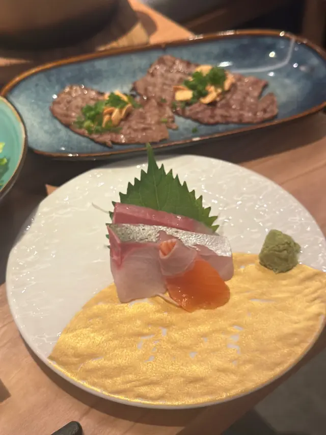 這間高級日本餐廳位於尖沙咀H Zentre,主打日式燒肉廚師發辦,嚴選不同部位高品質的日本和牛,提供吧枱專人燒肉服務,一邊燒肉,一邊講解和牛部位的特色及燒肉技巧等專業知識。店內環境寬敞舒適,裝潢以日本侘寂的美學為主題,以木材、石材及手工水泥磚等為主,氛圍禪意卻又不過份拘束,適合約會或慶祝。松 - $798/二人前慢煮鴨胸沙律慢煮鎖著豐富的肉汁,鴨胸嫩滑而不柴,新鮮翠綠的沙律菜伴以酸甜的果醋,還有香甜多汁的車厘茄。季節刺身三種三文魚有明顯的脂肪紋路,油脂豐厚好細膩;油甘魚滑順鮮甜,帶有濃郁的魚油香氣;鯛魚細緻柔軟且帶有彈性,有清淡的鮮甜味。肉類方面,嚴選黑毛和牛二種、和牛濕式熟成及和牛乾燥熟成各一種。和牛牛肋肉兼具豐富油脂、軟嫩與嚼勁,有濃郁的牛肉風味;肩胛肉油脂分布較均勻,帶有適量的嚼勁;臂肉既有嚼勁又帶有軟嫩的滑順感;內側後腿肉肌理細緻,油脂較少卻相當軟嫩。雞橫膈膜稀有部位,帶有適量的油脂,脆彈爽口帶有嚼勁。豚五花肥瘦均勻,外皮微微焦脆,內裡軟嫩香甜不柴。海膽和牛薄燒和牛切得薄厚均勻,快速炙烤表面微焦,內裡保持軟嫩多汁得入口即化,脂香四溢好甘香,豐腴的新鮮海膽滑順細膩,鮮甜中帶淡淡海洋風味。是日海鮮一種肥美飽滿的大海蝦,經處理去除腸,新鮮蝦肉特別爽滑彈牙富彈性,還有少許甘香的蝦頭膏。牛蒡黑豚肉味噌湯湯底濃郁醇厚,有味噌的鹹香,又有肥瘦適中的黑豚肉好鮮甜,又有脆嫩清香的牛蒡,層次分明好豐富。和牛蟹肉煲仔飯米飯粒粒分明,吸飽和牛與蟹肉的鮮汁,底層有一層金黃酥脆的鍋巴,香氣十足。和牛切得均勻細嫩得入口帶化,濃郁的牛脂香甜十足;新鮮蟹肉絲飽滿鮮甜完美平衡。季節雪糕焦糖雪糕絲滑綿密,焦糖的焦香與奶香融合得恰到好處,甜度適中不膩。夏日黃昏兩杯無酒精雞尾酒,清新的果香有豐富的碳酸氣泡,清爽解膩。…查看更多