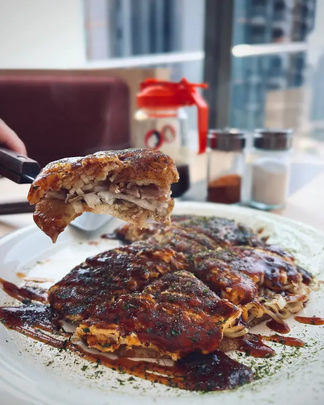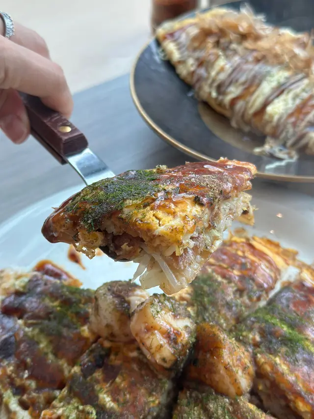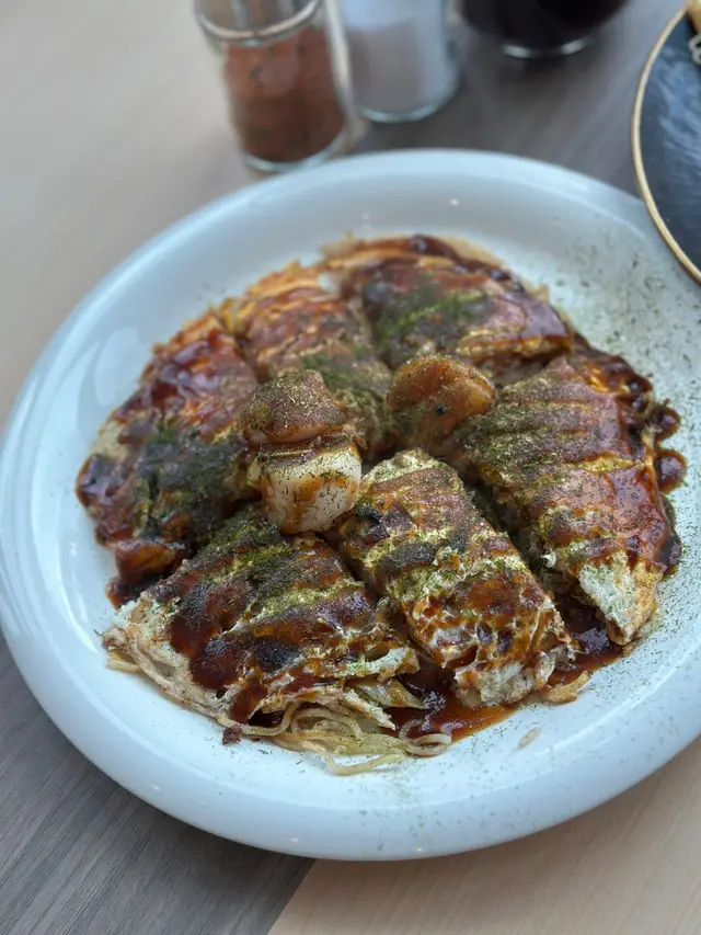 啟德SOGO雙子匯The Twins開幕後,當中有不少餐廳主打日式菜系,今次就來到主打正宗廣島燒和鐵板燒料理的御將燒OKOSTA,裝修以簡約木色為主調,落地大玻璃可以俯瞰啟德景色,讓午間柔和的陽光滲入餐廳,採光充沛,使整體風格和諧溫暖,採用開放式設計,近距離見證廚師精湛的廚藝,全程不時傳來滋滋聲響,香氣四溢。餐廳由百年歷史的日本品牌Otafuku 共同協辦,堅持使用品牌出品的經典醬料,店內有日籍師傅坐鎮,除了主打廣島御好燒及鐵板燒料理之外,還有午市定食供應。廣島燒 $98每份廣島燒都是席前即製,將新鮮食材混合後,放在高溫的鐵板上烹煮,11種材料逐層疊加:麵漿、木魚粉、椰菜、炸麵花、蔥花、豆芽、五花肉、麵條、雞蛋、御好燒醬和青海苔,無需混合,大阪燒和廣島燒的主要區別,在於後者加入麵條,還有分層式的製作方式,層次更加複雜,口感豐富。現代燒 $118御好燒的意思取自於加入喜歡的食材並依喜好的方式煎成餅,現代燒的特色是在傳統大阪燒的基礎上加入了炒麵,關西風做法就是將麵糊與所有食材拌勻後一口氣倒下去煎成圓形餅,然後再鋪上一層炒麵,淋上御好燒醬和蛋黃醬,底層是柔軟濕潤的御好燒,頂層是嚼勁十足的炒麵,吃完一整個就已經帶來滿足的飽肚感。歐姆蛋包麵 $138經典日式炒麵加入芽菜、紅蘿蔔、豚肉以炒麵醬炒香,再用蛋漿包裹,灑上輕薄的木魚碎,遇到熱氣後搖曳飄舞,外層蛋皮柔嫩濕潤,每一口裹滿濃郁蛋香,麵條炒得入味有彈性。…查看更多