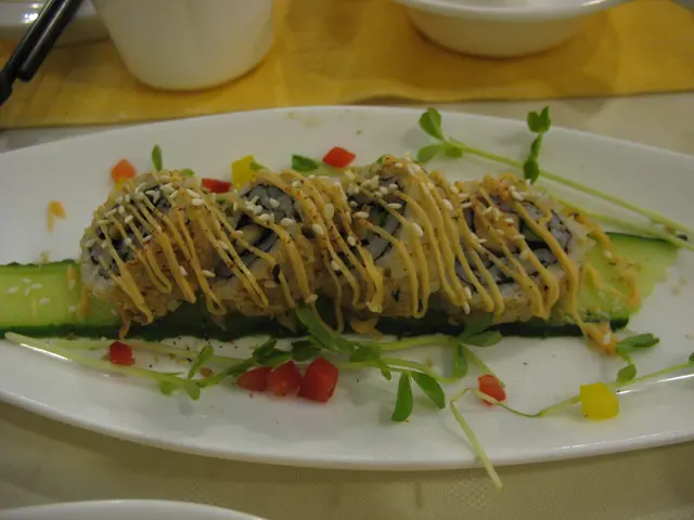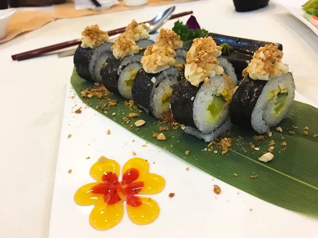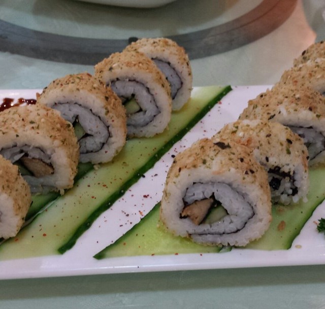 一坐下,待應就先為我們送上小吃 - 薄脆 + 以假亂真的牛肉乾人到齊後,第一道來的是四式拼盤。據我所猜,應該是新式改良的甜酸拼齋。它有假叉燒 (如閉上眼吃,質感、味道,跟真的叉燒沒有兩樣)、南瓜泥、豆腐干跟配了梅子粉的苦瓜。再來是御品鮮湯,湯如其名,都是一樣的鮮甜!第三道菜是彩虹壽司。正常的青瓜蘿蔔壽司配以沙律醬,這配搭很搭,很好吃~ 當晚,每個人對都愛不惜手呢~然後是鮮蝦四寶卷~~ 仿蝦度,不論外觀及口感都可以拿到滿分! 就是這道菜的芡汁有點多及沒味道~ 令這道菜有點扣分第五道是泰式雜菜餅,是另一道我的最愛。雖然看上去是炸的,但吃進口并不油膩,而且味道香濃可口。令人吃完想吃完一個後,接著吃另一個 第六道菜是普羅旺斯扇貝。它跟我想像中的有點出入。 一開始,我是以為那種有殼在底然後蒸熟的那種.. 出來,原來是假帶子炒蕃茄+腰果~ 味道不過不失~第七道菜,意式芝士焗茄扒跟外面西餐廳的沒兩樣,而且味道更濃郁一點~ 黑胡椒小炒中的配料,真的令我們覺得在吃青瓜炒瘦肉!來到日式燉飯的時候,其實我們所有人都在飽的狀態.. 但那個燉飯的香氣及味道令我們把整碟飯都吃光光