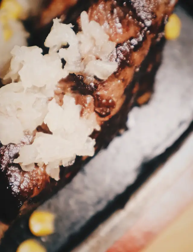 大角咀就黎得多,不過特登搵野食就好少,今日就黎到博文街見到呢間鐵板牛扒,逐個gram去秤既牛扒,點餐就係講你想揀牛既邊個部位,之後磅下幾重,再揀配餐。今日有啲肚餓,所以叫左個400g既後腰三角肉試下,因為之前聽人講呢個位置牛肉味會更濃,所以就叫左一試。店員會係你面前切好舊牛肉再問你配咩油同餐,我就揀左蒜油,配餐揀左飯、麵豉湯同可樂。牛扒即柯打即煎保證新鮮。牛扒上枱,好大陣蒜味傳入鼻,牛味亦都好香,400g黎講絕對夠食,牛後腰呢個位口感結實,而且牛味真係比其西冷牛柳既地方濃味,好啱我呢啲鍾意食牛既人。蒜油既香放埋落白飯配埋牛扒食就最啱,而且餐廳亦都準備左柚子汁伴碟,怕肥膩既朋友仔點一點就會多一種清新既感覺。…查看更多