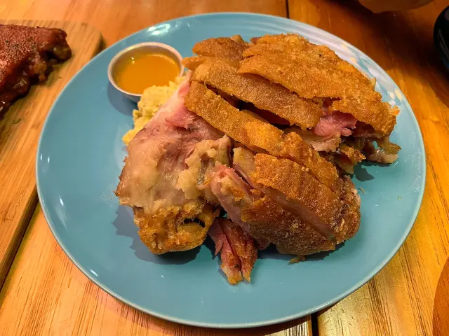 小妹同兩位朋友今晚來到這間德國菜餐廳。因為假日關係,餐廳只有正餐牌!(聽聞平日時間有$368的餐,有咸豬手、腸等等,很抵食。)我們決定叫一隻咸豬手和一客豬肋骨 Share。餐牌上,可以看到有兩款咸豬手。店員解說一款為蒸,另一款是炸的! 炸的比較香口。店員沒有介紹錯,炸的豬手口感豐富!皮脆肉軟,連肥膏也不會韌。豬手配上蜜糖芥末醬及加上酸菜,非常開胃。餐廳亦很細心預早將豬手切條,方便我們食用。而美式燒肋骨也很美感!肋骨肉燒得十分香軟入味,配上薯條份量十足,我們每人吃了3-4枝肋骨。再加上豬手的薯蓉打底,我們三個女仔也食得飽飽的。食左咁多肉,我便選了一杯熱薑蜜,味道有薑味,也不失蜜糖的甜味,很岩飲!對喉嚨也可以舒服些呢!整體來說,這個晚餐物有所值。坐得也很舒適。座位大大張的,椅下更有可以放置物品的箱子,方便客人。因為座位不多,建議大家早點去餐廳,免卻等位時間。…查看更多