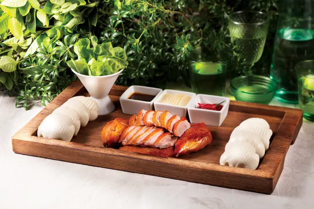 慢烤脆香茶燻鴨($198/半隻):半隻茶燻鴨以木造托盤呈上,另跟配四件荷葉餅及肥嘟嘟嘅生菜。半粉紅色嘅茶燻鴨皮層帶脆,肉質亦尚算軟潤,起碼唔嚡又唔乾。