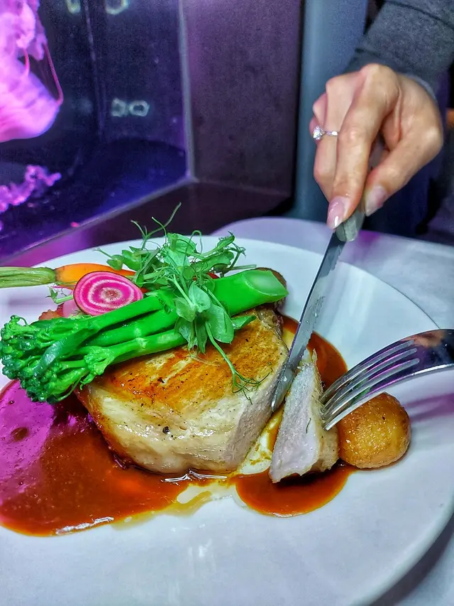 想去很久的餐廳,這次終於和朋友來到了!職員把餐廳門口的黑幕揭開,有點燈光隱約透出,昏暗的燈光,充滿神秘感呢!牆上有海洋的投影,仿佛置身海底世界一樣。玻璃水族箱前放有桌子,每張桌子後的水母種類都不同,原來水母有很多種類,各有美態,真的大開眼界啊!細看下水母真的很美😍,水母緩慢地游動,好像在跳舞呢~一邊欣賞水母優雅的舞姿,一邊享受美食,環境浪漫,氣氛很好,很適合情侶約會談心!♡美國粗薯條配自家製黑松露醬$78粗薯條很有質感,炸得金黃香脆,即使放冷了,也不會變得很軟身,而配上的自家製黑松露醬和平常吃的有點不同,這款帶一點酸味,可以減低油膩感。♡慢煮加拿大帶骨豬鞍$298 🥢必點🥢有蔬菜、蒜頭、蘿蔔、紫洋蔥伴碟。用上慢煮的方法烹調,所以肉質十分軟腍,豬鞍可以有這個口感,很不錯呢~而有些位置連住少許肥肉,更為香口。♡西班牙紅蝦三文魚子意大利飯$298紅蝦很大隻,蝦肉肉質彈牙,蝦上有亮晶晶的三文魚子。而意大利飯很入味,內裏有蘑菇,飯粒質感濕潤分明。♡Pinecoco $88 🥢必點🥢Coconut Milk,Pineapple,Milk,Cream由椰奶、菠蘿、牛奶、cream調製而成,口感creamy,表層是泡沫質感,有數件菠蘿,內裡還有點椰子絲,飲品味道很合我的口味呢!♡Mother Lovers $138Vodka,Peach,Cassic,Pineapple,Cranberry襯托一下環境點了一杯Mocktail🍸,由伏特加、桃、黑醋栗、菠蘿、蔓越莓調製而成,是水果配上伏特加的味道,易入口,酒味不會太濃。✔️餐廳設加一服務費 …查看更多