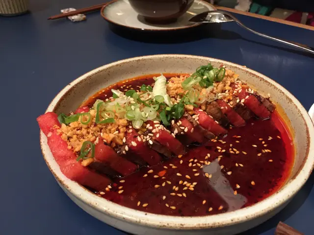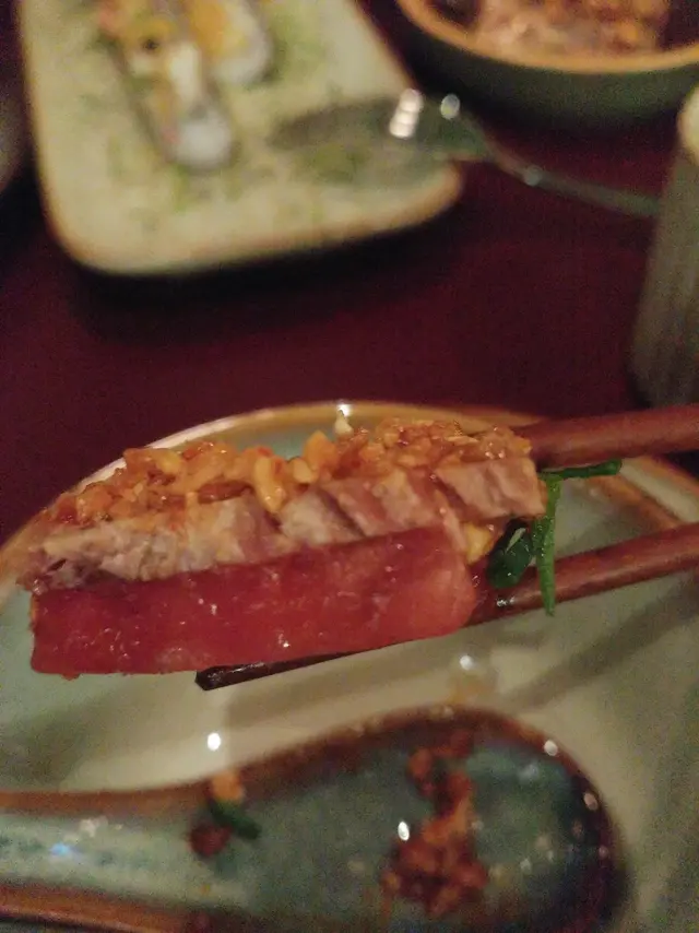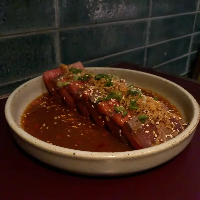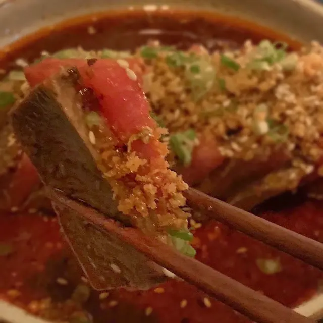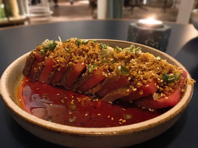 慢煮口水和牛面頰($130)分數: (7.5/10)口水汁挺辣,西瓜果甜多汁,亦吸收了口水汁,再配上慢煮和牛面頰,面頰口感非常彈牙,這三樣食材的配搭,味道及口感都十分特別。.黑磚豆腐 ($70)分數: (7.5/10)內裏豆腐軟滑,外皮煎了竹炭粉再炸,萬分鬆脆,加上面頭的黃金炸蒜,為淡味的豆腐添了一些蒜香。.草飼安格斯牛肋骨叉燒 ($395)分數: (8.5/10)採用了安格斯牛配上叉燒汁燒,平常吃到的叉燒用豬肉製,現在用牛。除了有叉燒味外,亦有牛味,肉質嫩,但有幾塊叉燒有筋,比較難咬開。.胡椒魚湯菜苗 ($130)分數: (8/10)魚湯味濃滑,有些少胡椒味令湯更突出。用了唐生菜菜苗,唐生菜的淡味令我們味蕾集中於胡椒魚湯味。上面有魚肉粒及妃子,魚肉入味。.松香翠炒飯 ($135)分數: (6.5/10)飯粒炒得粒粒分明,用蛋白及菜粒炒,表面灑了脆米及松子,令口感提升。不過,味道較淡,而且除了頂部的一塊黑松露,飯並沒有黑松露味,稍遜色。.42天飼養鹽香片皮鴨(half) ($340)分數: (8/10)想確保吃到這道菜,最好24小時前預訂,我們沒有預訂,幸好還有半份未賣出,不過等45分鐘。片皮鴨表皮較乾身,不會有很厚的脂肪,減少油膩感,肉質嫩。餅皮薄且每層分明,有葱及瓜和甜醬可跟片皮鴨一起包著吃。甜醬有點咸。…查看更多