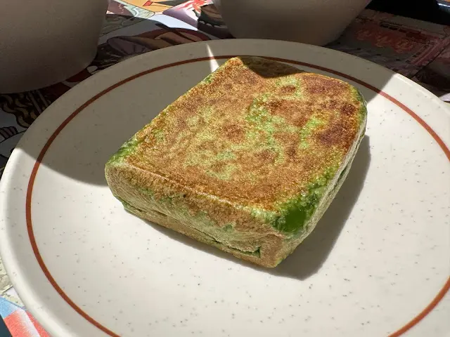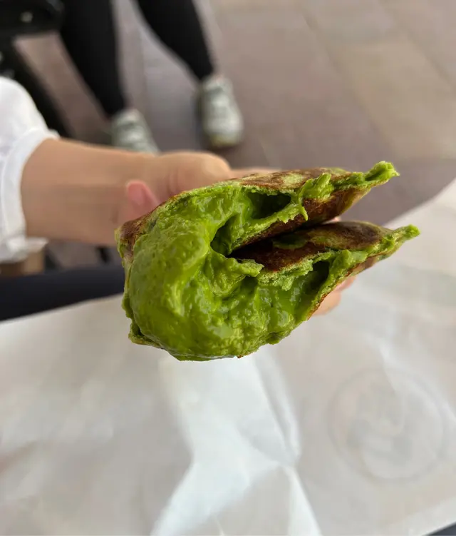 - 壓餅外層:煎到外脆,餅皮香甜口感軟糯- 餡料:以日本宇治小山園若竹的抹茶粉混合香濃嘅忌廉芝士,味道甘香,抹茶味濃郁,配上香濃嘅忌廉芝士,完美地滿足左我兩大願望。