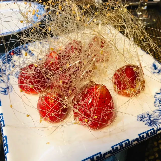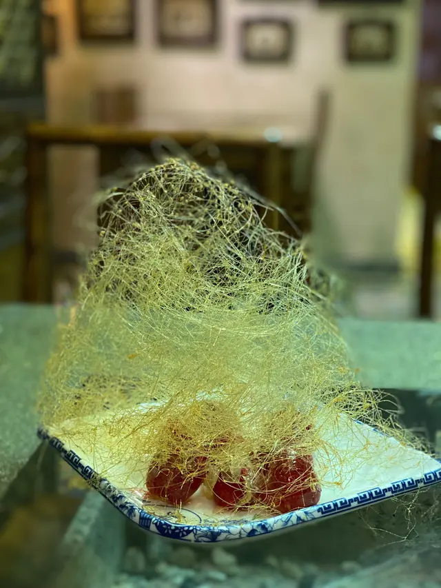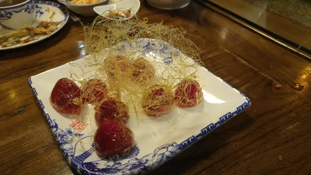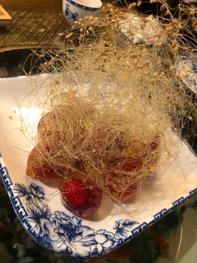 大雨淋淋,經過一家古老飯店,竟然有喜出望外嘅晚餐!用茶洗杯時,聞到一股好香好特別的味,已經對呢間餐廳有啲期望,原來係麥茶,好飲!之後叫左個素鴨,幾脆,但片皮鴨就一般,皮唔夠熱,鴨可以!因為一般所以無影相,哈哈😆喜出望外嘅小菜係啲乜,就係全芫荽炒孜然羊肉,估唔到有驚喜,好食!😋最後叫左個拔絲士多啤梨🍓,整得好靚,師傅好有技術,每一條都好幼細,好利害,最重點係個士多啤梨好新鮮,又甜又好吃!值得再來!👍🏻😏…查看更多
