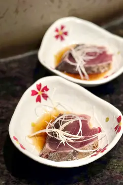前菜鰹魚刺身搭配京蔥絲及柚子醋,清爽開胃。