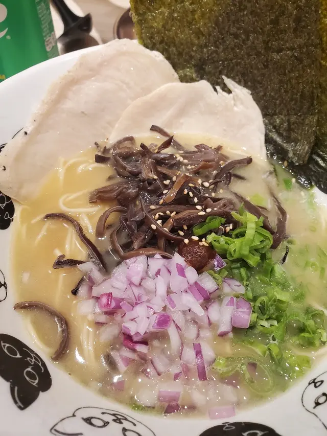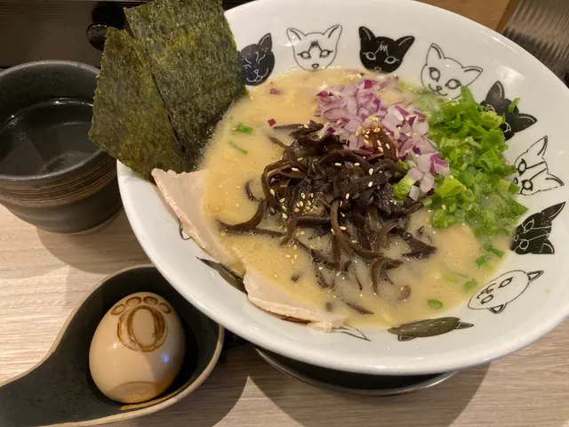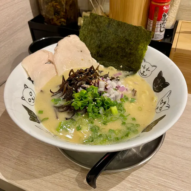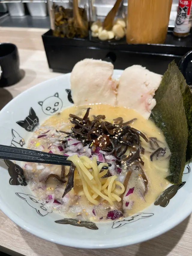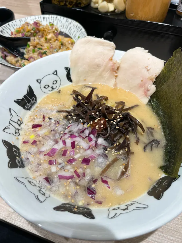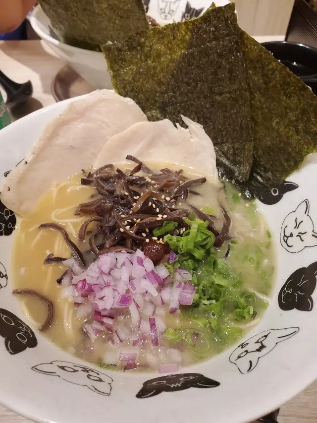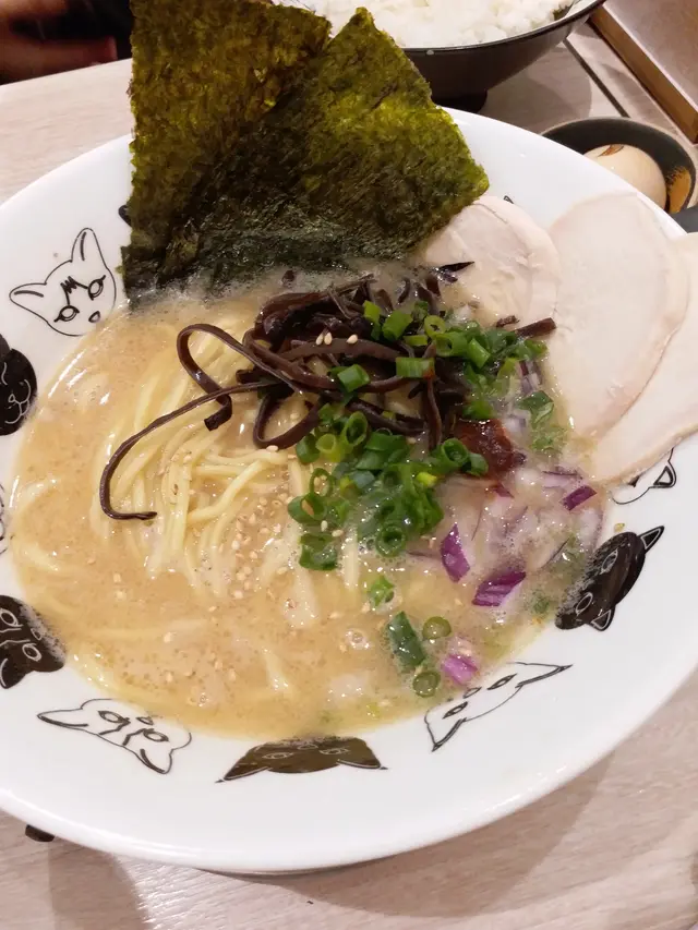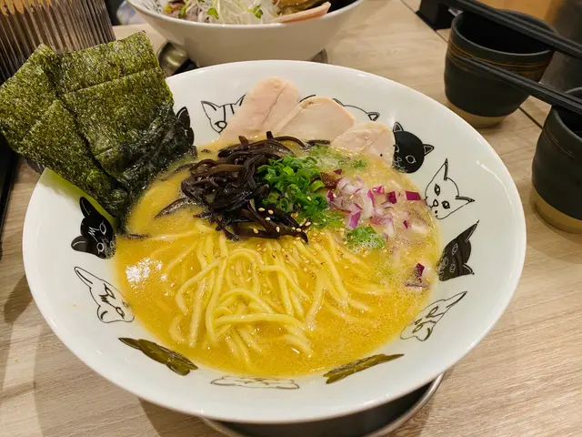 短短的漢口道附近已經有四家拉麵店,分別是「一郎」、「神山麵屋」、「日幕家」及「博多拉麵別天神」。今日帶上小女兒到Mirror AK成員有份開的「日幕家」,利申小編不是鏡粉。門口有隻小女兒喜歡的九尾孤,看清楚一點應該是隻九尾「貓」。對正對面的拉麵店,是否風水擺陣? 入口位置掛有幅水彩繪畫,相信是AK、AK哥哥及AK家中貓貓。甫入內看見這幅巨型壁畫,造型生動趣緻,相當吸睛。店方把家中貓貓成為生招牌,由飲品、拉麵碗以至店內裝潢,均有貓貓的身影,非常可愛。店主果然是愛貓之人,因此相信門口的九尾貓不是什麼風水佈陣。小店供應4款湯底:包括雞白湯、豚骨湯、味噌湯、蜆貝醬油湯,配料則有雞肉或豚肉叉燒。疫情下的限制已經取消,但是左右各有膠片分隔,枱面位置不多,有水瓶、調味瓶、筷子筒……沒有多餘地方。【日幕拉麵 $98】小女兒揀左濃厚醬油豚骨湯配慢煮豚肉叉燒,走葱走蒜香辛味醬。order紙上沒有木耳,否則小女兒一定全走。日本拉麵大部分都跟温泉蛋,「日幕家」就沒有。不過就有小女兒喜愛的紫菜,有兩片而且大大片。常見的傳統日式叉燒改成低溫慢煮叉燒,質感較鬆軟嫩滑,不過小編喜歡傳統經過炙燒的叉燒多些,多些油脂多些香味。【日和拉麵 $98】濃厚醬油雞白湯拉麵配慢煮雞肉叉燒。小編的拉麵沒有走配料,試下店方的原味道。用上生的紫洋蔥比較少見,炒過的洋蔥有甜味,相反生洋蔥味道比搶喉不是人人可以接受。小編覺得加入青蔥及生洋蔥蓋過雞白湯味道。同樣用慢煮烹調方法去處理雞肉,就算用雞胸肉用質都軟淋嫩滑。不過小編喜歡有質感的雞肉多點。麵底沒有梘水味,口感彈牙,掛湯不錯。單叫汽水 $25 ,小食加飲品套餐只是 $35,當然要份套餐。小食選擇有炸雞、羽根餃子及無骨雞翼。小編點了【羽根餃子套餐 $35】,餃子底部那層煎得薄薄又少少焦香的皮,夠完整賣相不錯。餃子細細隻入口方便,餡料濕潤味道不錯。拉麵整體味道合格,勝在拉麵定位合理又冇加一。但是湯頭缺乏個人獨特之處,難以留下難忘印象,非到不可的理由。…查看更多
