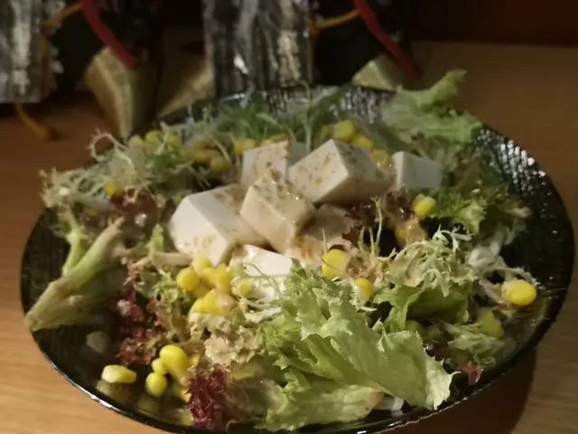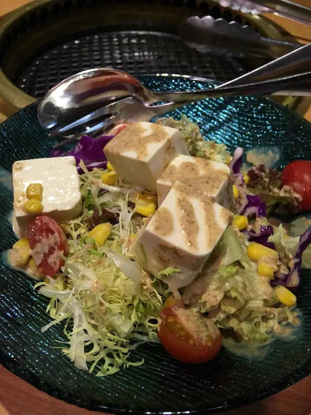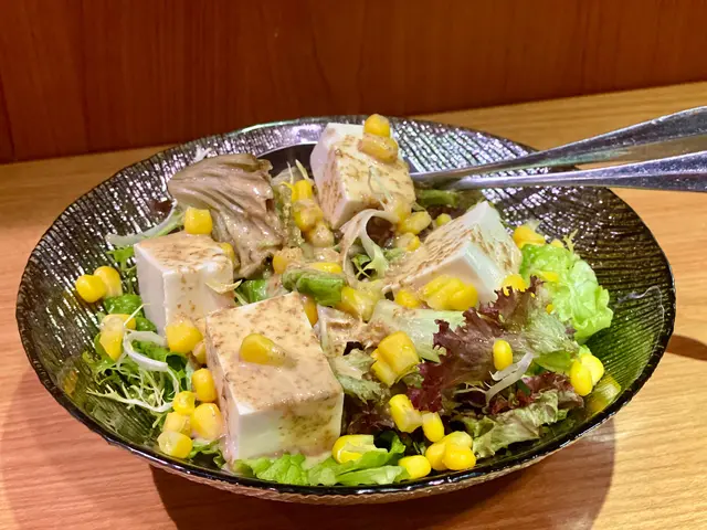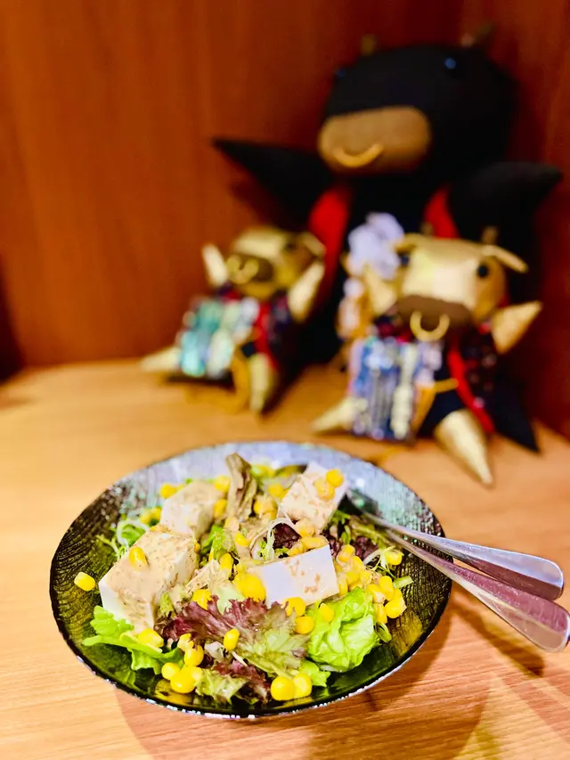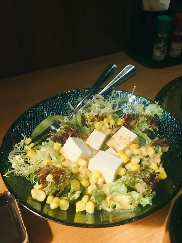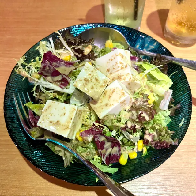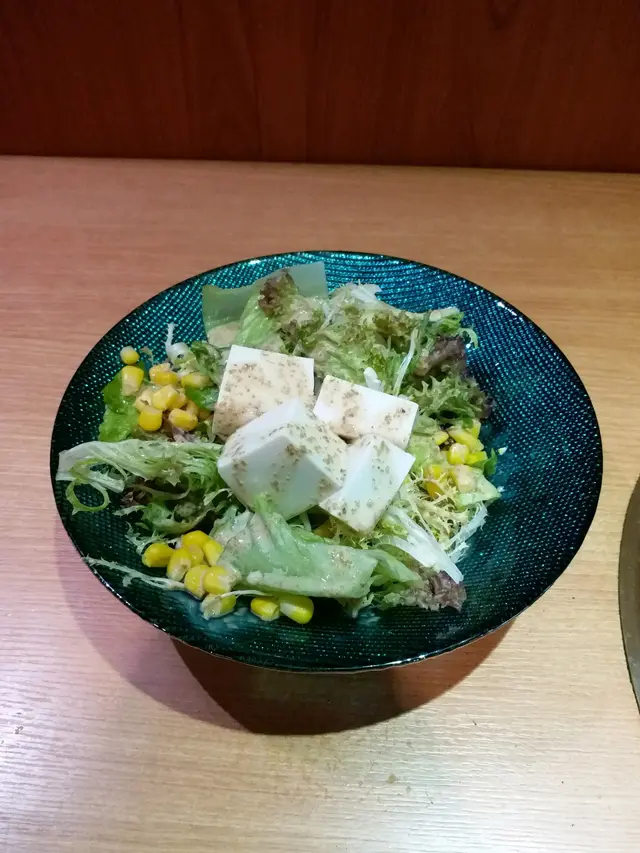 安曇野豆腐,配大量沙律菜及玉米粒,以胡麻醬調味