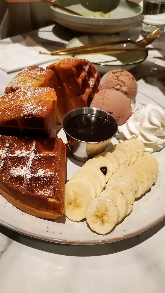 夜晚開始有啲風都想走出商場感受下自然風,嚟咗單車館水池果邊行下食下嘢先講大家最關心嘅甜品同飲品日落巴黎$108-估唔到份量咁多!窩夫蛋香撲鼻,食落好香脆,加上朱古力醬、雪糕同香蕉點綴正呀!