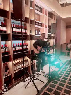 現場有男歌手表演,彈著吉他,聲音低沉磁性