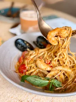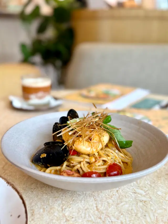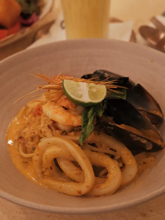 一上枱,芬香撲鼻👃🏻。冬蔭功味好出,又幾辣,醬汁係濃稠,一啲唔稀,滿滿掛係每條意粉,意粉7分鐘熟度有咬口,配料有三隻青口,大蝦,魷魚圈同蕃茄仔,份量多,調味很不錯!