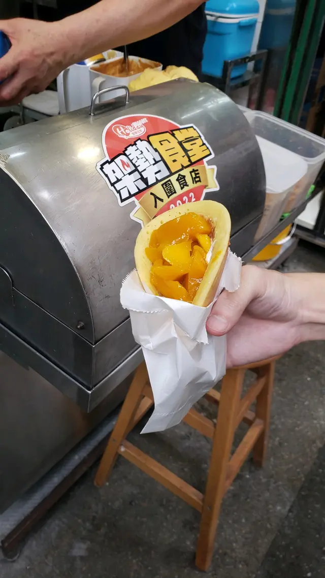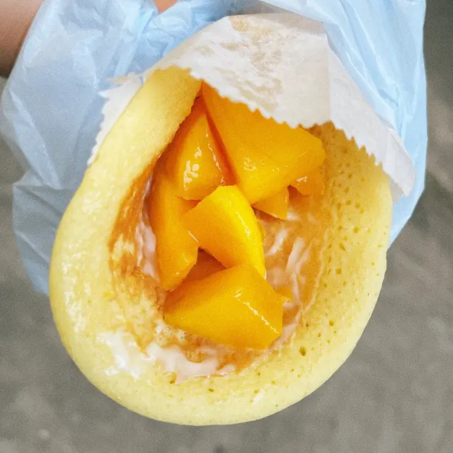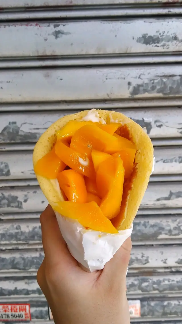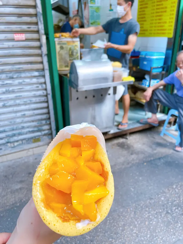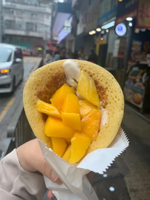 見咁多人推介過 「沙律淨芒果班戟」,有次夜晚去買,話芒果賣曬。今次順路經過,見有芒果就買嚟一試!平時薄皮pancake嘅芒果班戟食得多,熱香餅版本第一次食🥞見佢正煎緊一塊滿心期待啦,殊不知原來煎完旆係盒入面做備用,將盒入面嗰6-7塊其中一塊拎出嚟整比我。所以誤以為熱辣辣嘅我,有啲失望😞。之後佢會放上沙律醬同勁多芒果,所以好易食到好「呢HEA」,記得搵地方停低食完先走,同準備紙巾🧻! 咁芒果頗甜嘅,又唔似浸過糖水,不過塊班戟就完全冇蛋香味。試過一次就夠🙈…查看更多