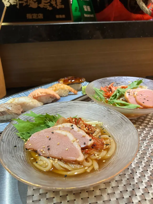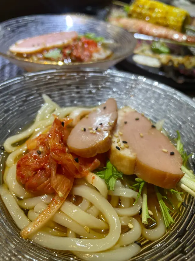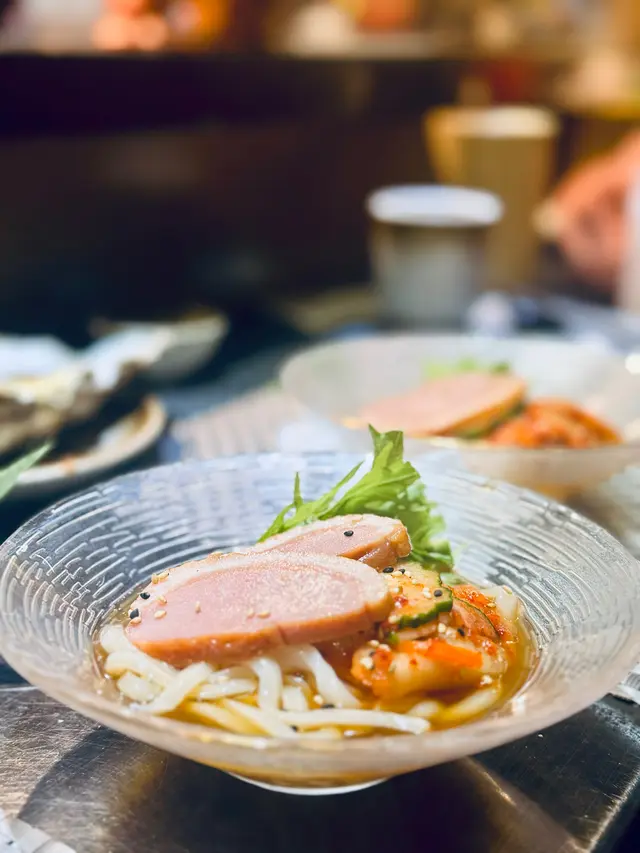 一人一碗冷烏冬🍜,放入了兩片煙鴨胸同泡菜配料,令湯汁帶少許甜辣味。冷稻庭烏冬有驚喜喎!口感係極級彈牙!看來過冷河🧊的做法很有一套!