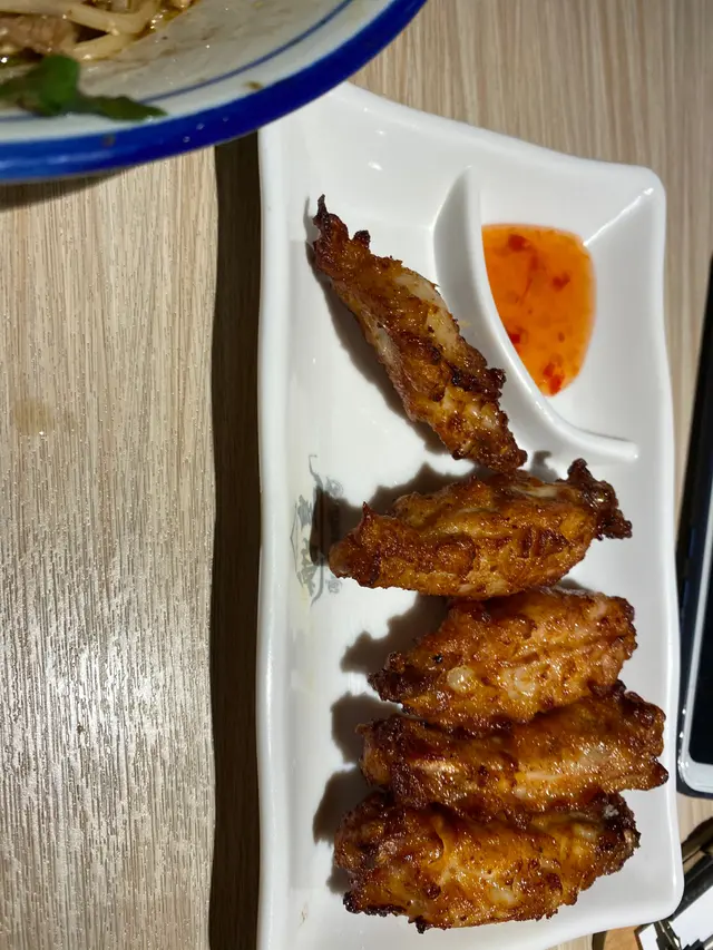 今次來到一間泰國過江龍餐廳-船皇餐廳環境很細, 一張枱坐4個人有點逼枱上有魚露, 辣粉, 泰式酸辣汁, 甜醬油先看看Menu, 主食分湯麵和撈麵, 每樣有4款可以選擇第1款是豬肉, 第2款是雞肉, 第3款是牛肉, 第4款是豬牛雞都有頭3款還可以選擇大碗或細碗, 還可以選擇辣度至於麵可以選蛋麵, 米粉, 金邊粉或河粉船皇湯麵午市套餐 ($78)配料有炸豬皮, 牛腩, 牛肉片, 牛丸, 雞絲, 雞翼, 豬肉, 豬肉丸和豬潤當日豬潤賣完了, 所以店員說多給我一粒豬肉丸, 配料味道沒有特別船皇湯麵我點了河粉, 這個河粉和平時我們常見的不見河粉很寬很大一塊, 口感和一般河粉一樣湯底都非常濃郁, 河粉吸湯力強, 食到最後湯差不多都沒了泰妹雞翼其實就是炸單骨雞翼, 旁邊有酸甜醬, 味道不錯春卷+蝦卷蝦卷外邊用薯仔絲包住再炸, 都算脆, 不過蝦比較細春卷入面一樣是蝦, 只是外面不一樣而已凍柚子蜜這間店凍飲是用碗盛着的, 很特別, 味道很甜, 柚子醬下太多了總結, 這間店做得最好是湯底和麵, 配料和小食都很一般…查看更多