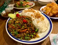 📍荃灣見到餐廳張餐枱上放住塊紙coaster, 上面寫住’only good vibe’, 同朋友食好食嘅嘢,又真係可以帶出好嘅氛圍😋首先講咗唔好嘅地方先: 餐廳有限時, max 1hr 45 mins, 想食慢少少或者試多幾道菜時間都有啲趕; 其次地點比較偏遠,無論喺荃灣或荃灣西地鐵站行過去都起碼要十幾分鐘;另外餐廳座位比較逼夾,其他客人坐喺旁邊回音會比較大;好彩我哋坐門口角落位,冇咁受兩邊騷擾講返食物質素: 沙嗲串燒,兩串雞兩串豬,味道還可;泰式燒豬頸肉,燒得好香,夠入味辣椒膏炒藍青口,青口份量幾多,加埋泰式配料,夠哂鮮嫩惹味至於兩杯泰式特飲,分別係凍泰式奶茶同芒果百香果沙冰;可能行咗幾遠路,所以覺得特別好飲😅最後甜品方面,掙扎咗好耐想要椰汁芒果糯米飯,但最後揀咗泰國街頭椰子味雪糕🥳🤭並不太甜;椰子味好出,同埋有兩片海底椰同花生點綴,作為飯後甜品,一流下次有機會再去的話,一定要試埋佢哋嘅蝦醬炒飯,豆醬炒通菜同椰汁芒果糯米飯…查看更多