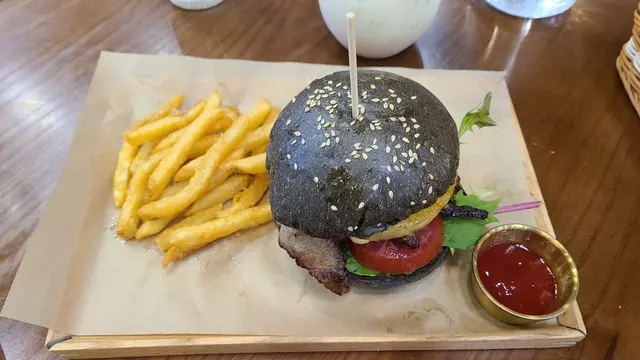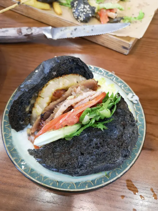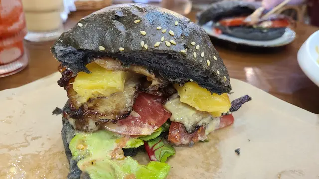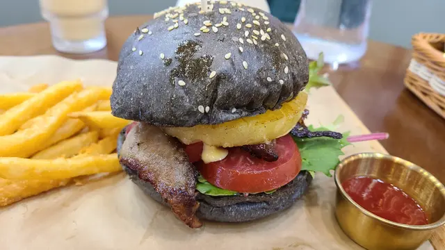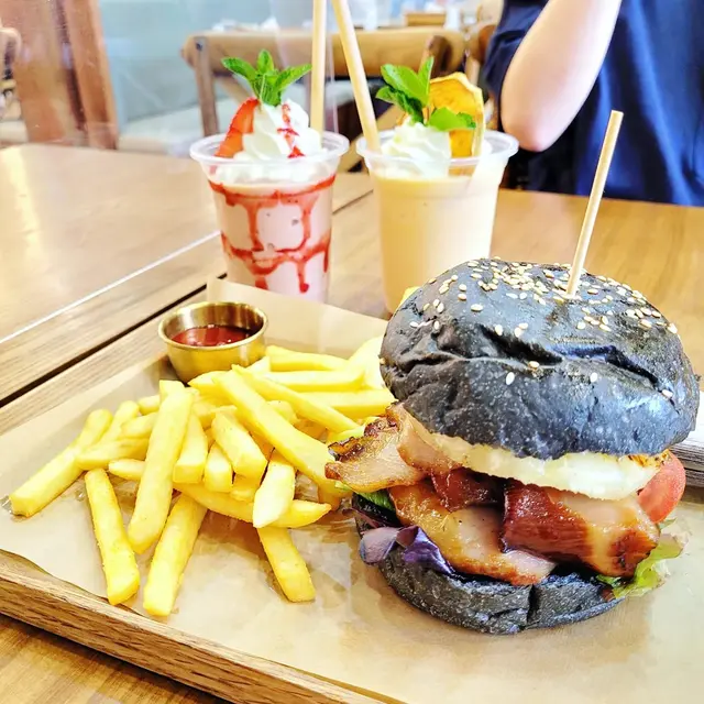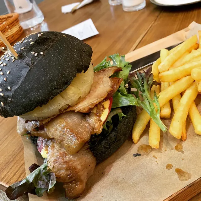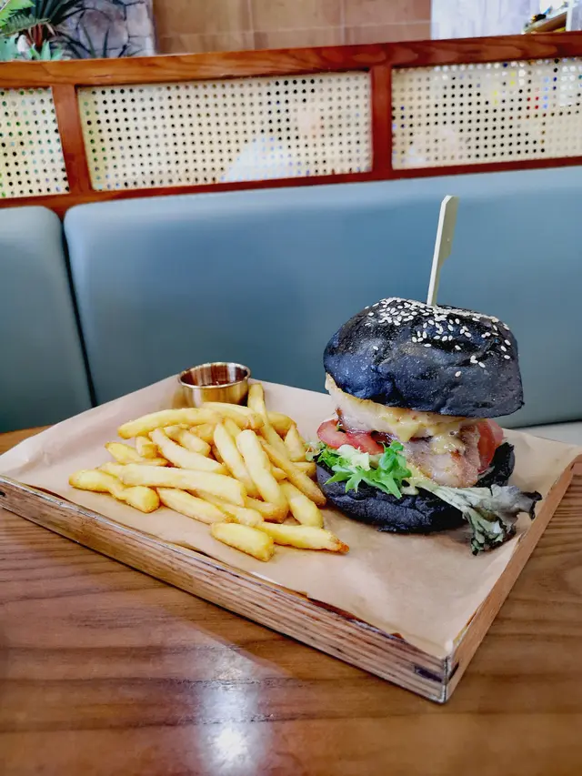 終於約到fd 黎依間觀塘出名既打卡cafe!!一到已經唔少人係門口影相室外實在太熱,我地就無坐啦都係入面嘆下冷氣lunch menu 好似會轉下佢地用qr code 自己落單d 野飲都同menu 有唔同竹炭漢堡特別,明顯都烘過黎仲脆豬頸肉份量勁多!!!起碼6,7 塊襯埋個汁甜甜地好味!!漢堡夾菠蘿又係無得輸