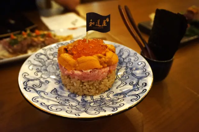 千層塔顧名思義,就喺一層疊一層,亮點喺海膽多、拖羅蓉多、三文魚籽又多,令到色澤亮麗,未食已興奮呀!附有紫菜片,食法喺以紫菜夾住啲日本米及各款餡料好似手卷咁一齊食,紫菜好脆口,啲餡料晌口腔鮮味大爆發,加上以赤醋調好味嘅飯粒,口感黏糯,實在幸福感滿載。