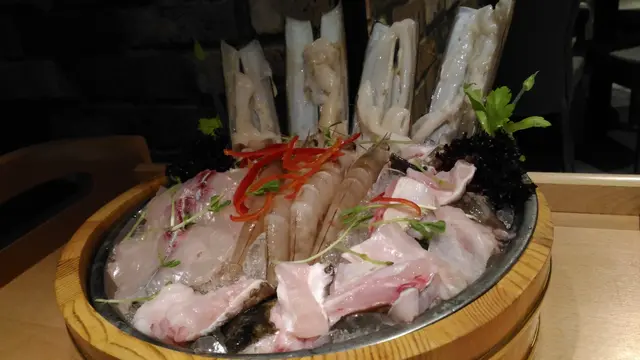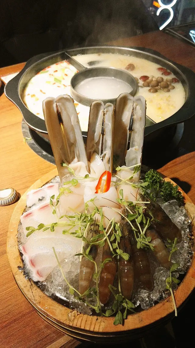 上星期跟友人飯聚時,曾說下次就到這家火鍋店用饍,想不到沒幾天便成事。昨晚6:45到場時,店內沒多少顧客,友人更早到場取了在窗邊的位置,邊吃飯邊看外旺角晚間的繁華景象,也是一件樂事。店內採用套餐形式,按人頭收費,基本上大部分菜單是已擬定好的,選擇性不高。而且分量也是按人頭計算。前菜:柚子沙律是用柚子汁拌生菜,很清新而且味道也配;涼拌蟲草花口感很爽脆,麻油味很香,很好吃湯底:雖然套餐內已擬定好,但可按自己喜愛的口味去選擇而不會另行收費,其實跟自選沒分別。我們選了東方美人鍋拼青花麻辣鍋,另外套餐內可選火焰清酒煮蜆,為試吃也選了。東方美人鍋即是竹絲雞湯配桃膠,湯頭非常清甜,還沒涮菜料前,可以直接飲用,也沒有甚麼口渴感,用來涮肉或菜都很不錯,值得推薦青花麻辣鍋辣度不算低,味道也不錯,像小弟般嗜辣者也推薦一試,不過始終缺少了重慶正宗牛油麻辣鍋的香氣及層次,比較偏向乾辣。至於火焰清酒煮蜆就是視覺比味覺優勝,侍應在煮蜆時燃點火焰,縱非首次吃這種菜式,看到那效果還是忍不住驚呼,煮好後再注入豬骨湯頭,整個湯及蜆的味道有點不太配合,蜆也真的太迷你了.....菜料方面,因朋友戒吃牛肉,故選了黑豚肉配小黃瓜,而侍應也很貼心,因套餐拼盤內有牛丸,特意來問我們是否不吃牛肉,可轉換成其他配料。友人決定讓小弟吃牛丸故沒有作出更改。黑豚肉配小黃瓜:雖然瘦肉較多,但豚肉涮煮後也不會變韌,非常鮮嫩,用小黃瓜卷著肉來吃,口感也變得比較清新,味道很好,每人約有5件,分量來說還可以海鮮拼盤:套餐本來有帶子、魷魚、蝦、蟶子及龍躉魚片,因可以加點錢就將其中一款改成龍蝦,故我們就每人都將蝦改成龍蝦。上菜時,卻只見每款只有2件,即是每人1件!龍蝦就頭及身各有半份。基本所有海鮮都很新鮮,蟶子沒沙,清理得很乾淨,龍躉肉很厚也鮮味;至於龍蝦就明顯是淡水養殖,不過肉頗多,蝦頭也鮮美,整體甚佳。響鈴:每人2件,無甚特別,就是一般火鍋店的響鈴拼盤:包括有牛丸、魚滑棒、豚肉餃、釀冬菇、三色墨魚片,每款每人1件,也是太小了吧......豚肉餃及魚滑棒均很好吃,釀冬菇可能始終用煎或炆的方式會比較好吃吧,燙火鍋感覺只算一般;另外兩款就是一般火鍋店水準蔬菜拼盤:有金菇、生菜、油麥菜,通常都是解膩用,分量不多,就如上文說用美人鍋去涮煮很配合飲品方面,小弟選了芒果沙冰,但還有冰粒,感覺沒打得很仔細,不過不會太甜,感覺真材實料;朋友選了柚子茶,表示不過不失套餐還有甜品,這晚的是柚子果凍,不會過甜,口感很滑而清新,在吃罷一頓火鍋後,這個還頗有解膩之用,很不錯!埋單每人要350元,以分量而言,價位是相當高了,雖然整體味道是不俗,但這個價位的選擇性很多,似乎性價比就不算太高,也難怪就算到晚上8:00這類繁忙時間,店內還是只坐了約一半的桌。聽朋友說周末的生意會好一些吧⋯⋯…查看更多