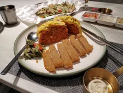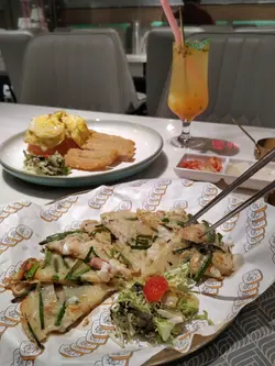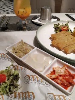 光猛明亮又顏色鮮艷o既韓式餐廳,d 檯凳夠晒闊落,坐得好舒服。一坐低,侍應姐姐隨即送上一式三款kimchi 作為餐前小食,係免費的,味道酸辣,先來刺激一下我o既味蕾。韓式蛋包飯有住一層滑蛋,裡面係酸酸甜甜o既飯,諗起都開胃,又夠晒營養~ 呢度o既蛋包飯($68 無加一) 唔係採用將好似火腿洋蔥之類o既碎料同飯一齊炒o既製法,而係有一份主食,可以配吉列豬扒或者雞扒,我配o左豬扒。d 飯帶點糯米飯o既texture,黏度高如同飯團一般。加o左蕃膏去整呈橙色,仲有少少似香茅o既味道,非常惹味,會係小朋友o既至愛,食完人都開心d!單係個飯連埋面頭隻蛋都已經夠晒實淨飽肚,仲有成塊吉豬,CP 值夠晒高~海鮮煎餅($78) 泛起油光,食落同中式薄撐類似,但佢當然足料好多,除o左蔥條之外,隨時一片都兩粒鮮蝦仁,仲有魷魚、青口等料夾雜其中。呢個同頭先個蛋包飯都附有一份沙律仔,蘸上柚子醬,靈舍富韓式風情。叫完主菜加配飲品可有優惠,試o左杯鮮雜果梳打(加$18)。蘊含百香果、芒果同菠蘿,附上薄荷葉,鮮甜清爽,夏天飲最正!…查看更多