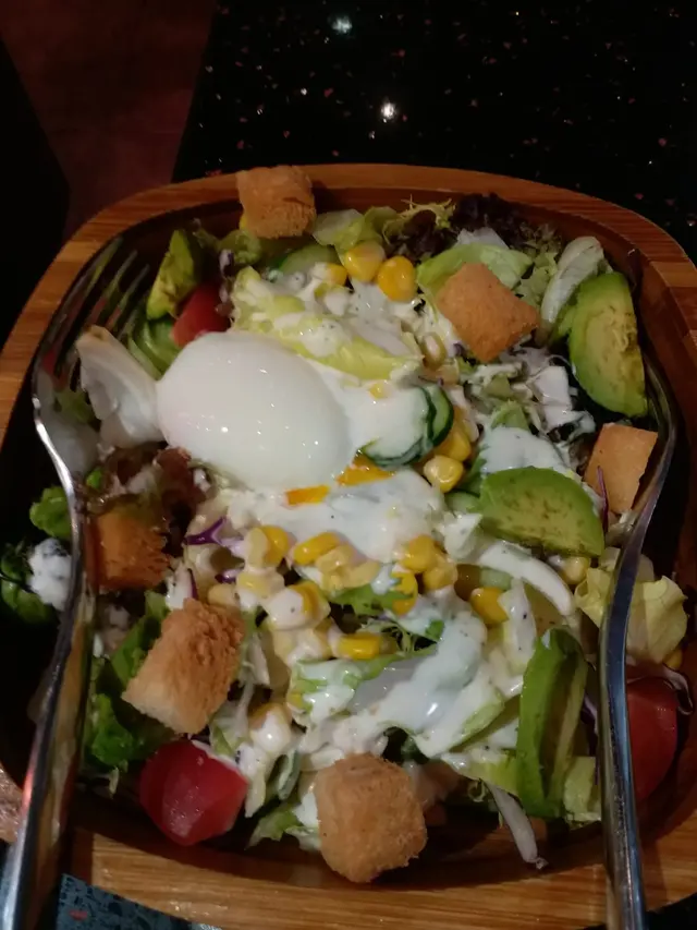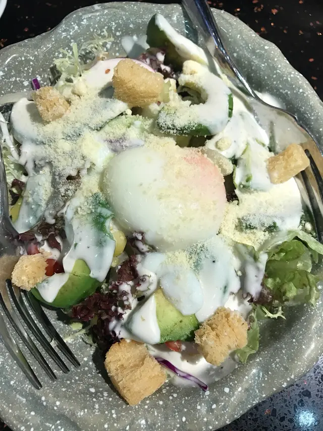 第一次試溫泉蛋配沙律,估唔到溫泉蛋同沙律嘅配搭好夾,溫泉蛋可以調和蔬菜嘅草青味,配埋沙律醬、牛油果同多士粒,整體唔錯。