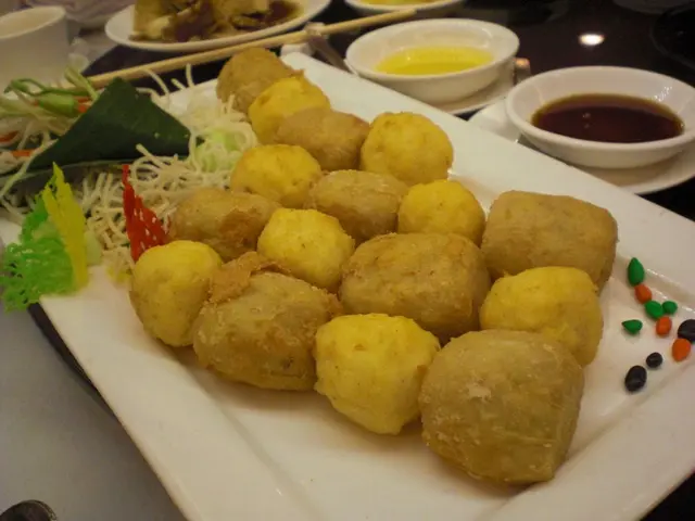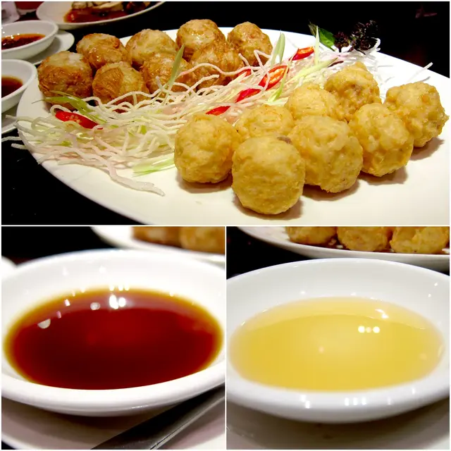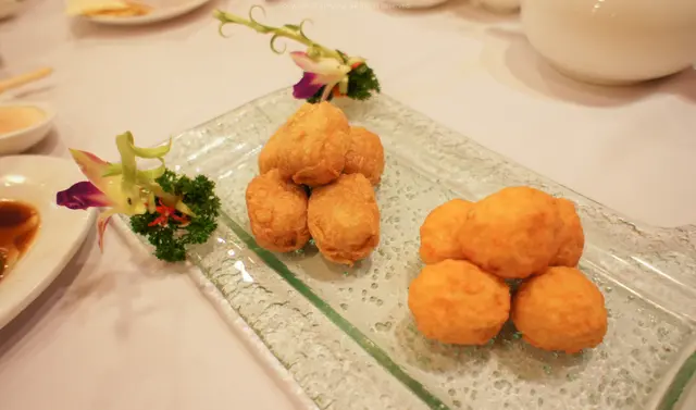 豬軟骨般的脆口,但再軟身一點所以更易入口~~潮陽炸雙棗 $104初頭見個菜名,仲諗緊咩係雙棗,唔通係紅棗同蜜棗?!?!雖然個圓碌碌外型同size的確同棗類相似,但原來係炸蝦丸同炸蟹丸,仲有一D肉係入面混合,增加了口感興豐富了味道~~我本來就好鍾意食蝦丸蟹丸,所以呢道菜真係好得我歡心架~~外皮炸得香脆但完全唔油~~~!餡料的味道有濃郁的海鮮味,個人就比較喜歡蝦棗,因為比較彈牙~~!!