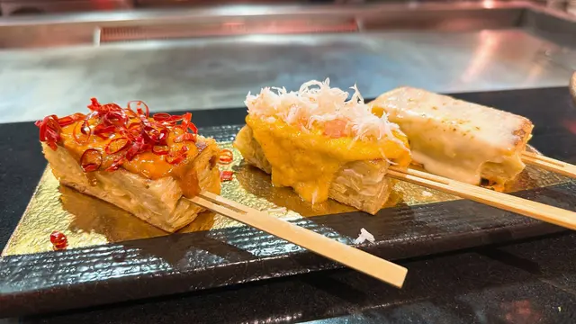去黃埔AEON shopping完之後,行過對面九號水產搵食,就見到有一間新開嘅日式鐵板燒「火舞町 」,主打各款鐵板燒和日式料理,餐廳裝潢風格和日本居酒屋🏮一樣,有鐵板燒吧檯,可一邊觀看師傅烹調的過程,一邊品嚐美食~澳洲🦞龍蝦尾 Australian Lobster Tail($298)龍蝦尾個頭都幾大隻,兩個人share食都可以!餐廳用左牛油煎香,肉質爽彈,值得一試!⭐️推薦❗帶子(兩隻)Scallop($88)刺身級帶子煎至7成熟,鮮甜味美,不錯吃。見到火舞棒Okonomiyaki Sticks係餐廳名物,梗係要試吓啦~😂底層係大阪燒,配上各種Topping,各有特色。建議最好由淡至濃食用~芝士火舞棒($58)—熱熔芝士淋上面⭐️推薦❗香草牛油蟹肉火舞棒($108)—香草牛油醬汁灑上鮮蟹肉,蟹🦀️味十足!⭐️推薦❗麻辣火舞棒($58)—塗上秘製麻辣醬汁,再灑上辣椒,麻辣惹味!⭐️推薦❗豚肉大阪燒 Pork Okonomiyaki($128)以麵糊、椰菜混合製成嘅餅底,口感厚實爽脆,加上日本🇯🇵豚肉和蛋一起煎,塗上香甜醬汁,灑上木魚絲,口感豐富有層次。芝士玉子燒($98)玉子燒七成熟,食落好滑溜,加上裏面夾着滿滿嘅芝士,「芝」味十足!…查看更多