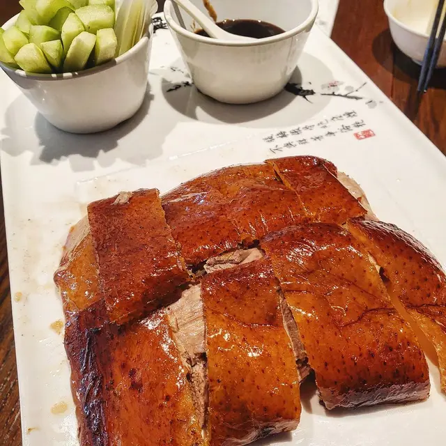 時隔一段日子,又有機會來到美中鴨子啦!將軍澳新開這間分店人龍真多,六時多就在App拿位,等了大概45分鐘才能入座呢⋯同行四人就點了一個套餐,比較划算。首先前菜有清新柚子沙律,份量也不少,柚子加上沙律醋醬非常醒胃呢!另外就是青蔥麻香雞,雞肉挺嫩滑的,而且非常入味,麻辣的感覺很過癮。再來就是上海大碗雲吞鴨湯,侍應一早分好再逐碗上,總共有四碗四隻餃子,還多了一碗淨湯。略嫌湯比較重味精味,雲吞也就不過不失。而鴨肉就比想像中好,挺嫩滑有濃郁鴨味。這碟北京宮爆蝦球個人非常喜愛。 蝦球的size非常大之外,質地也很爽口彈牙呢。炸粉不會太厚,配上甜甜的醬汁美味非常!接著就是主角啦— 烤北京填鴨(半隻),每人大約分到三至四件,其實已經很足夠。烤鴨的皮和肉是分開上的,可以自由配搭。外皮香脆但油而不膩,肉質鮮嫩有嚼勁! 而薄餅皮是剛剛蒸好的熱騰騰,非常薄身! 一口包著鴨子、青瓜、京蔥和片皮鴨醬汁,真的是大滿足啊!最後是茶樹菇小豆苗。豆苗很新鮮嫩綠,配上上湯讓人吃著很舒服的感覺。總括而言,四人餐的份量不少,吃著吃著都非常飽足,整體不錯呢!…查看更多