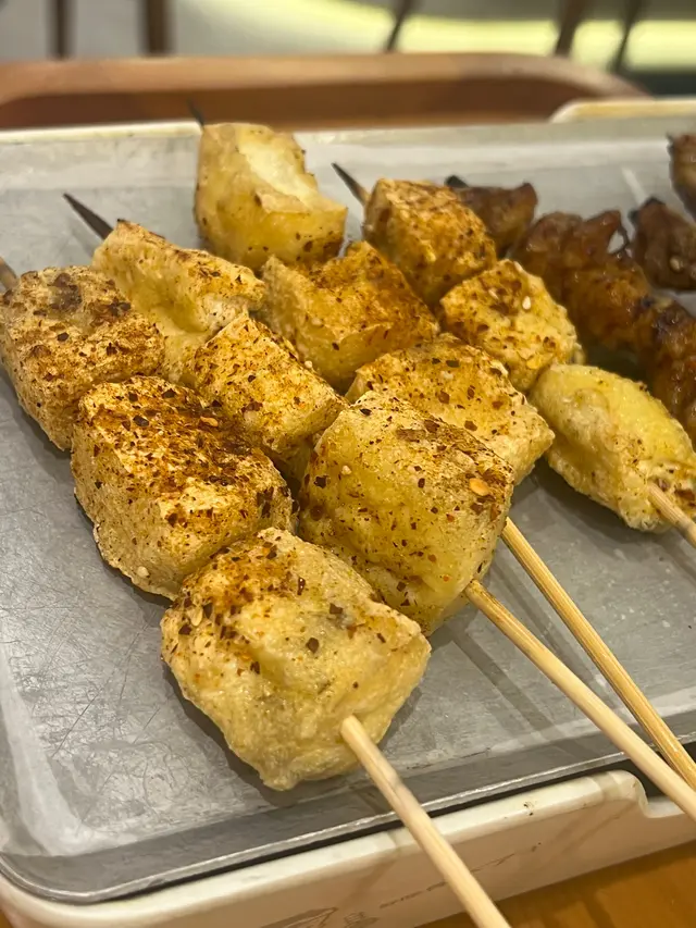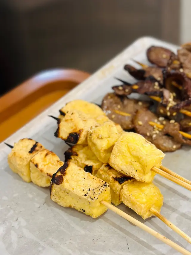 Happy Friday來到這間串燒的餐廳,餐廳用上木系裝潢,座位舒適。串燒當然要熱辣辣才好吃,所以有爐烘着保持溫度。而所有串燒調味適中,不會有過鹹的味精味道,可以吃到食物的鮮味。當日我們點了這些食物,整體味道都不錯!.♡燒黑豚五花肉用上西班牙黑豚肉,帶有點脂肪的五花肉,每次串燒燒烤都必點的!♡烤新鮮臭豆腐一口一粒,外皮烤得香脆。♡北海道蒜蓉粉絲大扇貝 🥢必點🥢用來自北海道的大扇貝,新鮮大隻,放進口裏非常厚實有咬口,再配上蒜蓉粉絲更加惹味!·♡蒜蓉烤新鮮生蠔用上餐廳自家製的蒜蓉調味,生蠔味道新鮮。♡燒墨魚滑釀青椒比較少有用來燒烤的食物,墨魚滑比一般外面吃的煎釀三寶厚身的,而且感覺不油膩。.♡小野人燒雞翼選用優質農場出產的雞類產品,無添加無激素,食得更安心!.♡燒鱈魚脆脆一大片的燒鱈魚,附上的沙律醬再配上燒鱈魚,鹹鹹甜甜的。♡鹽燒小墨魚串 🥢必點🥢墨魚都很大粒,咬下去充滿口感,吃得出墨魚都是新鮮的。♡糖燒牛奶方包 🥢必點🥢牛奶方包塗上牛油,再加上糖粒去燒,口感香脆,牛油香味,再加上糖粒的甜絲絲味道好滋味!♡小野人黑松露蘑菇烤飯 🥢必點🥢黑松露蘑菇加上有芝士,整個飯味道都十分香濃,附上紫菜,給我們用來包住飯吃,口感更加豐富,而且多了一陣紫菜的香味。♡芝士撈一丁 🥢必點🥢用上三種芝士,所以芝士味十分香濃,撈麵夠乾身,每一口都可以吃到芝士的香味,芝味無窮呢!飲品方面,點了♡小野人手打檸檬茶$38和♡元氣森林水果茶$38,兩杯都大大杯,水果茶上面還有一片菠蘿,可以解油膩感,配串燒吃一流。