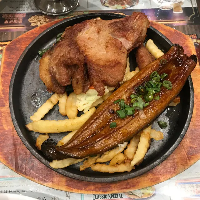 -烤豬扒拼鰻魚😀 ($138)估唔到咁大份,原條鰻魚睇落好肥美,有亮澤,好吸引,不過鰻魚食落肉質偏乾,不太鮮嫩,有點失望,而豬扒都係超級大塊😚,肉質嫩滑,好口感,配埋燒汁,味道都幾夾☺️,另外命帶少量西蘭花🥦,紅蘿蔔,豆角,而薯條都好好食🍟,夠香脆,點茄汁食最正👍🏻-皇牌雜扒😍($118) 依個皇牌雜扒十分豐富,分別有豬扒🐷,牛扒🐮,雞扒🐥,珍寶腸,煙肉和薯菜,全部扒都大大件,肉質嫩滑,食落唔會好鞋👍🏻,份量十足,配埋燒汁都幾好味,而且豬扒,牛扒和雞扒都不會有好多脂肪👍🏻-鮮牛油特大菠蘿包🤗($36)菠蘿包真係好大個😆,平時係茶餐廳都不會食到咁大個菠蘿包,不過菠蘿皮不夠香脆😅,不夠軟熟,彩落熱辣辣的菠蘿包夾住一塊厚厚的牛油,正😚-懷舊紅豆冰🍹(跟餐$10)食個紅豆冰真係好好飲❤️,真材實料,紅豆份量和甜度都岩岩好🥰,仲有椰奶香味,不錯👍-香濃朱古力咖啡🍹(跟餐$10)依杯都好好味,朱古力咖啡曬了一些朱古力針,賣相都幾靚,朱古力味幾突出,配埋咖啡都特別😍-…查看更多
