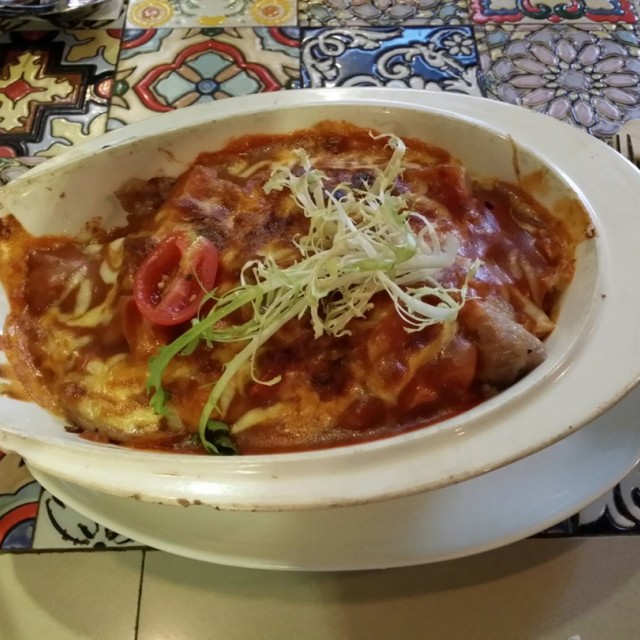 撥開芝士.仲有番茄係面, 汁都好夠. 令到下邊飯唔會干身. 豬扒食起身夠lum唔會咬唔開. 咬起身入邊仲有肉汁. 肉嘅份量都好夠. 中間仲有一粒車里茄做裝飾. d汁唔會太酸或太咸. 各方面都算幾滿意. 呢個價錢我覺得好抵食.有埋嘢飲40蚊有找. 下次會再黎.…查看更多