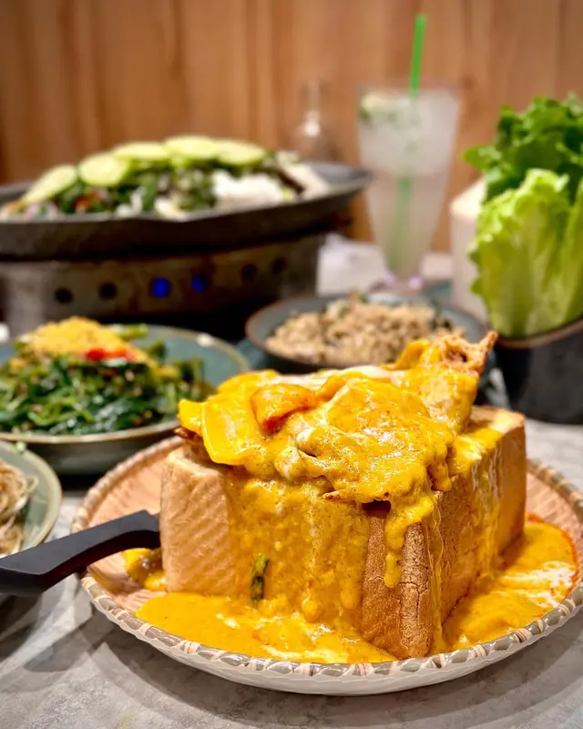 今日來了高質泰國菜~這餐廳性價比高~餐牌有多款套餐選擇~因應唔同人數可以揀唔同既套餐~今日同爸爸兩人食~點了一個二人套餐。套餐上有一埋食物名單,可以揀指定數量既野食,款式又多,總有岩自己心水既野食。點了一客無骨海南雞半隻~份量好足料,海南雞件又嫩又滑,啖啖肉超滋味,仲有個美味醬汁,沾上來食,帶點點香香辣辣,相當惹味。鮮蝦炒金邊粉,大大份好惹味,夠鑊氣。拌埋花生碎等等配料一齊食!金邊粉又香又美味,仲配上唔同食材:爽口彈牙鮮蝦、豆腐卜、魷魚等等,相當滋味。另外焗黃咖喱麵包軟殼蟹,這個菜式賣相吸引,大大件的麵包磚,淋上熱辣辣既黃咖哩~黃咖哩又香又吸引,而且香而不辣的,非常吸引!大人小朋友都岩食!仲有兩隻軟殼蟹放在麵包磚上,餐廳把軟殼蟹分為四份放到麵包磚上,食用時非常方便。軟殼蟹金黃香脆,脆卜卜,啖啖肉,相當滋味呢。食了一頓又抵食又高質又飽肚既泰國餐!…查看更多
