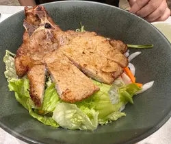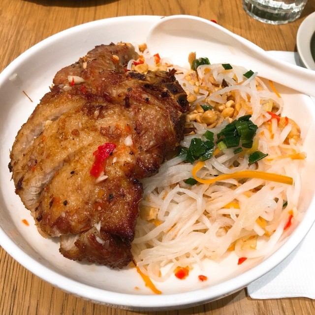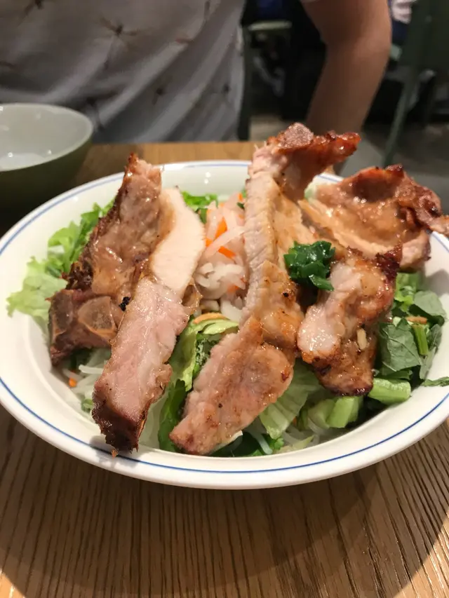 大概六點鐘左右,未到正式晚飯時間,見到呢間裝潢幾別緻比起其他分店多左一份小清新既感覺餐廳內空間感十足,樓底高,係正商場中央,較為通透不過可惜座位之間並唔算寬落,四人枱之間只係隔左一條好小的空隙基本上同搭枱無乜分別,當時食飯左右兩邊都坐左人,所以有點逼服務方面,點餐都係自己手機落單,隔左十分鐘左右就上菜食物評價燒豬扒撈檬 $95每次黎食都係食撈檬,因為佢既配菜好足,芽菜生菜蘿蔔絲花生都比足感覺上都比較新鮮同無咁油,佢既魚露味道偏淡,落左半枝先夠味至於豬扒,口感唔錯,肉唔會太鞋又有少少汁,食落口第一淡有少少甜味可能係醃左D汁既味道,不過整體都係好食燒雞撈檬 $95燒雞份量相對較少,畢竟個價錢並算平,只係比得2串雞肉分量但係雞肉都係嫩口同埋滑,所以都係好味整體而言,越南菜黎講價錢偏貴,但係餐廳環境相對較為乾淨服務黎講亦都無乜,手機落單,比錢都係自己拎張單出去,咁都要加10% ,不過論食物黎講都係好食,值得推介