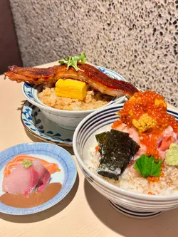 今天跟爸爸來到東薈城逛街,之後去到商場搵食,東薈城有很多不同種類的餐廳,看到這間日本餐廳,見他的餐牌食物圖物都相當美味,而且食客滿滿,爸爸說不如試一試。被安排到吧檯就位,清晰看到廚師為食客準備食材拼砌丼飯。看過餐牌後,我們點了一客炙鰻魚丼,另一個點了特上海鮮丼。食材新鮮,而且兩款食物都相當好味,首先說一說炙燒鰻魚丼,鰻魚丼香氣四溢,剛剛炮製好的炙燒鰻魚,不但香噴噴,而且看到整條鰻魚又長又肥美厚厚的,令人食指大動。鰻魚油香入口超惹味,配埋鰻魚汁拌飯,整碗丼飯相當大滿足及美味,除了有厚切鰻魚外,還有數件厚切玉子,甜甜的相當有口感。另一款點了特上海鮮丼,特上海鮮丼未來之前,會先品嚐前菜和刺身。刺身一共有四片,店員先建議先吃兩片,之後留下兩片會在最後跟鯛魚湯一起食用。鯛魚刺身片混上了胡麻醬,鯛魚片刺身鮮甜無比,混和了胡麻醬來吃更有另一種口味,十分特別。當廚師拼砌好海鮮丼後,看到這客特上海鮮丼賣相超級豐盛,一大堆豐富又色彩鮮艷的海鮮,形成柱體放置到丼飯中央。食材相當豐富,有海膽、紅雪蟹、三文魚子、赤蝦、緋魚子、象拔蚌、螺肉、魷魚、金䱽魚、金䱽魚蓉⋯⋯⋯混和了醬油跟Wasabi,之後慢慢添加於丼飯之中,十分美味,魚生不單止鮮甜,而且混和了飯粒一起進食相當好味 。每一啖飯都會吃到不同的海鮮。味道跟口感都相當好。一丼二吃當然沒有這麼簡單,當吃剩了三份一的丼飯,可以叫店員添上鯛魚湯,看到廚師會即場加熱和調味鯛魚湯。不用一會兒熱辣辣的鯛魚湯便送上。然後慢慢地加個丼飯之中,再把先前預留的兩片刺身放到湯飯內。這個鯛魚湯味濃,魚湯味很香甜,變成了湯飯口感和味道都大大不同,十分特別,而且一款丼飯可以吃到兩種不同的感覺和口味,相當滿足。鯛魚片放置於熱湯中微微加熱,鯛魚片都變熟了,嫩嫩的粉紅色,口感嫩嫩的,非常好味。餐廳不但有普通的丼飯,還有一丼二吃的海鮮丼,總有一款岩自己。…查看更多