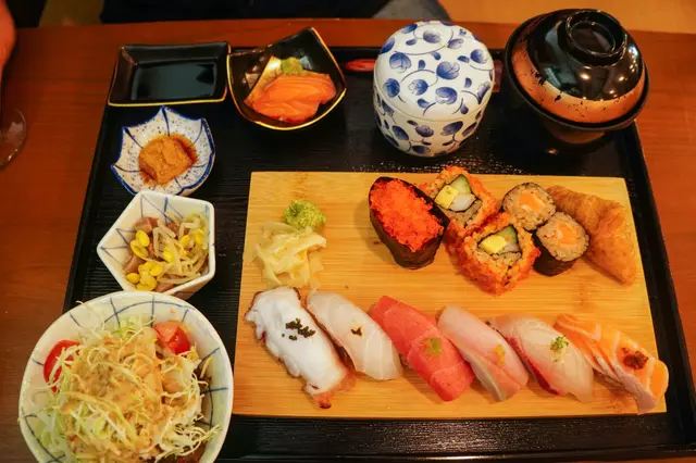 尖沙咀有很多吃日本料理的餐廳,但要說印象特別深刻的就數這間。和道屋是樓上店,而地下那層有無面男坐鎮。從門口位置已經有日本風的打卡位,直到餐廳內的氣氛都頗為濃厚。這裡亦有榻榻米座位,感覺更像去了一趟日本。午市商務定食由 HKD 88 起,在尖沙咀來說這價錢夠吸引。除了午市定食,主餐牌看起來都吸引,所以點了個 海膽生蠔杯 (HKD 88)會用高腳杯來放海膽和生蠔,打卡度滿分。海膽味道都幾濃郁,配搭肥美香滑的生蠔,旁邊的柚子啫喱頗酸,很開胃。吞拿魚他他雜錦拼冷稻庭烏冬 (HKD 108)定食份量一點也不敷衍,有胡麻醬沙律、軟嫩的牛舌、三文魚刺身。還有加了些蟹肉又不會很淡味的茶碗蒸和麵豉湯。主食的吞拿魚他他雜錦上層是鮮美的吞拿魚蓉。之後下方是角切的魚生,還有最底下是牛油果,可以用紫菜包著來吃。不論是在味道、口感上都很豐富。另外還有入口煙韌彈牙的稻庭烏冬,最後吃埋蕨餅就完滿了。特雜錦壽司定食12件 (HKD 138) 壽司包括了卷物、軍艦。壽司飯使用的不是白醋,而是醇厚的赤醋,與刺身很搭配。…查看更多