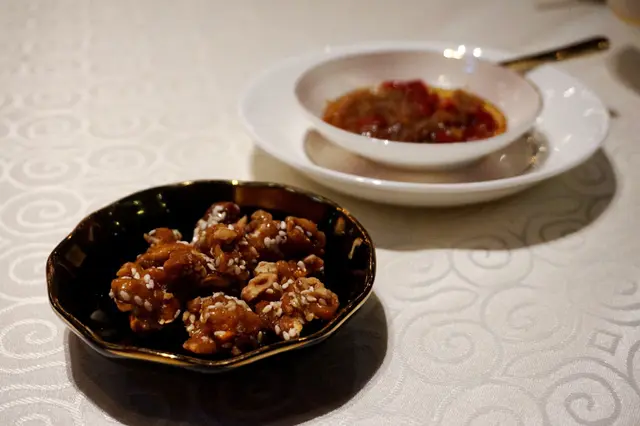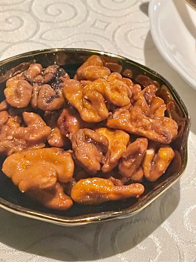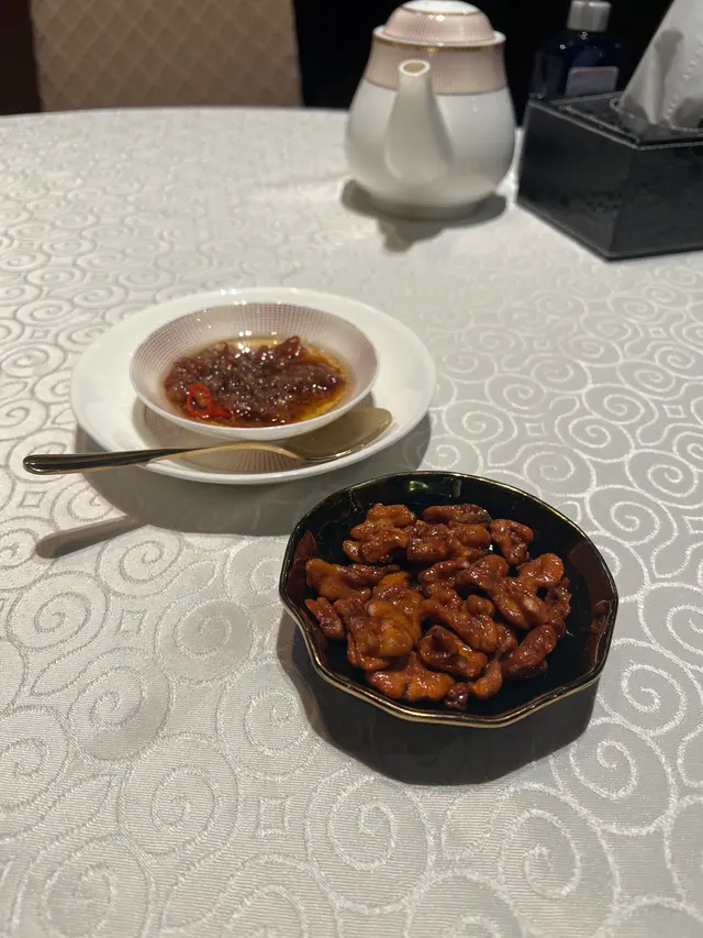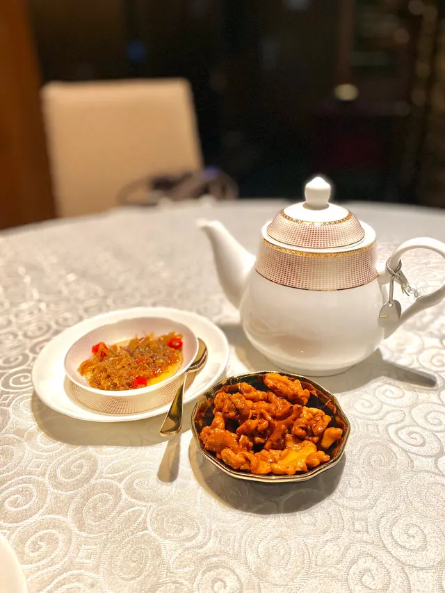 想搵間坐得舒服既川菜,睇到呢間啲相好似幾唔錯就黎試下。環境係幾舒服,夠闊落,週末晚市黎都只係得幾枱客,幾啱傾計。一入座就上小食,係琥珀合桃,都幾香脆,沒油益味,如果再甜少少就完美。前菜揀左積木茄子,炸得幾好,炸醬薄,夠脆身,外面有花椒胡椒調味,都幾好食。之後叫左嗰素湯,竹笙花菇燉菜膽,清清甜甜,用料唔錯,幾好飲。脆皮黃油鹽香雞都皮脆肉滑(除左雞胸之外),雞味幾濃,都唔錯。最差既係水煮桂花魚,唔夠麻唔夠辣唔夠香,而且魚既肉質唔嫩... 紅薯粉係好幼身,太稔唔彈牙,有啲失望。整體都ok,但就唔係正宗川菜,想食辣野,呢間就未必滿足到。…查看更多