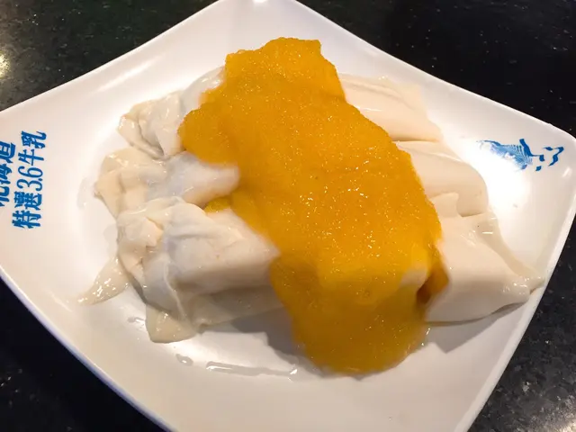 白雪黃金卷係一陣白色椰汁嘅皮包住一舊芒果肉上面有芒果汁~咬落濃濃芒果味