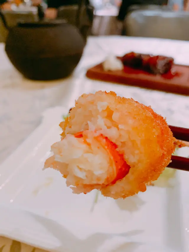 安排到附近商業大廈嘅一樓,裝修好普通頗舊,枱與枱之間嘅距離窄,好嘈。就係好屋邨酒樓嘅感覺。🤔糯米炒膏蟹似乎係呢度嘅招牌菜。但係食落比較普通,米飯食落好多飯焦,硬硬哋嘅感覺,唔係炒糯米飯嗰種香軟煙靭嘅質感。蟹本身正常水平。整體嚟講冇乜特別,唔明點解係招牌菜。黑松露燒鵝另一個招牌菜,食落唔係非常濃烈嘅黑松露味,係帶淡淡嘅黑松露香,黑松露味道唔會好霸道。燒鵝比平時食開嘅燒鵝味道淡一啲,可能咁樣會更突出黑松露味,都幾特別又好味嘅。不過燒鵝本身就比較多肥膏。🤔即燒乳豬樓下有玻璃比你睇到伙計親手喺度明火燒乳豬,咁特別梗係要點下。但係食落又冇咩特別,乳豬皮同肉中間有肥膏,肉嘅味道比較淡。普通水平。💯龍蝦炒米粉全晚最鍾意呢碟。佢同平時酒樓嘅龍蝦炒伊麪味道唔同,係用咗味道濃郁嘅龍蝦湯汁,撈埋龍蝦肉同埋炒米粉。龍蝦汁嘅味道香濃鮮甜,龍蝦肉都好爽口鮮甜。好味!👌🏼古法金錢雞其實就係一嚿雞肝上邊插住一嚿肥豬肉,再點甜甜地嘅蜜糖汁。雞肝質地有啲乾,肥膏整得幾爽口。雖然係好邪惡,但味道唔錯嘅。蜜汁脆燒鱔符合預期嘅味道。👌🏼百花炸釀松葉蟹鉗超級大嚿!味道同平時酒樓食嗰啲差唔多。石澳梅菜蒸菜心菜心幾清甜,撈埋梅菜又帶點惹味。唔錯。👌🏼啫啫生菜煲:味道正常整體嚟講,黑松露燒鵝同埋龍蝦湯炒米粉最出色。其他就係正常酒樓水平。…查看更多